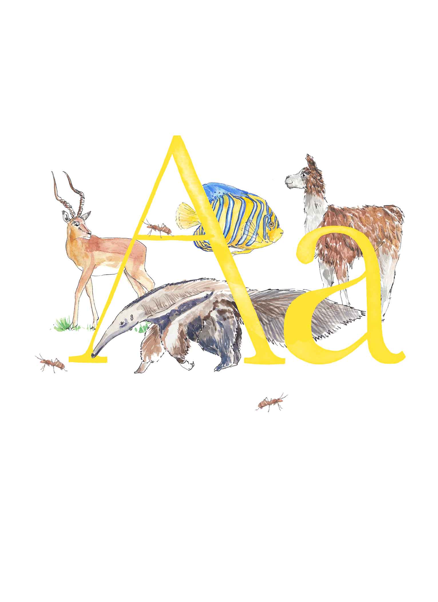 A – anteater, antelope, angel fish, alpaca, albatross, ant