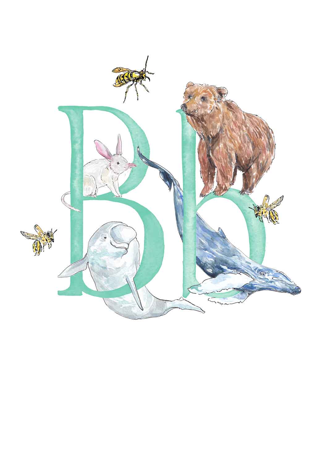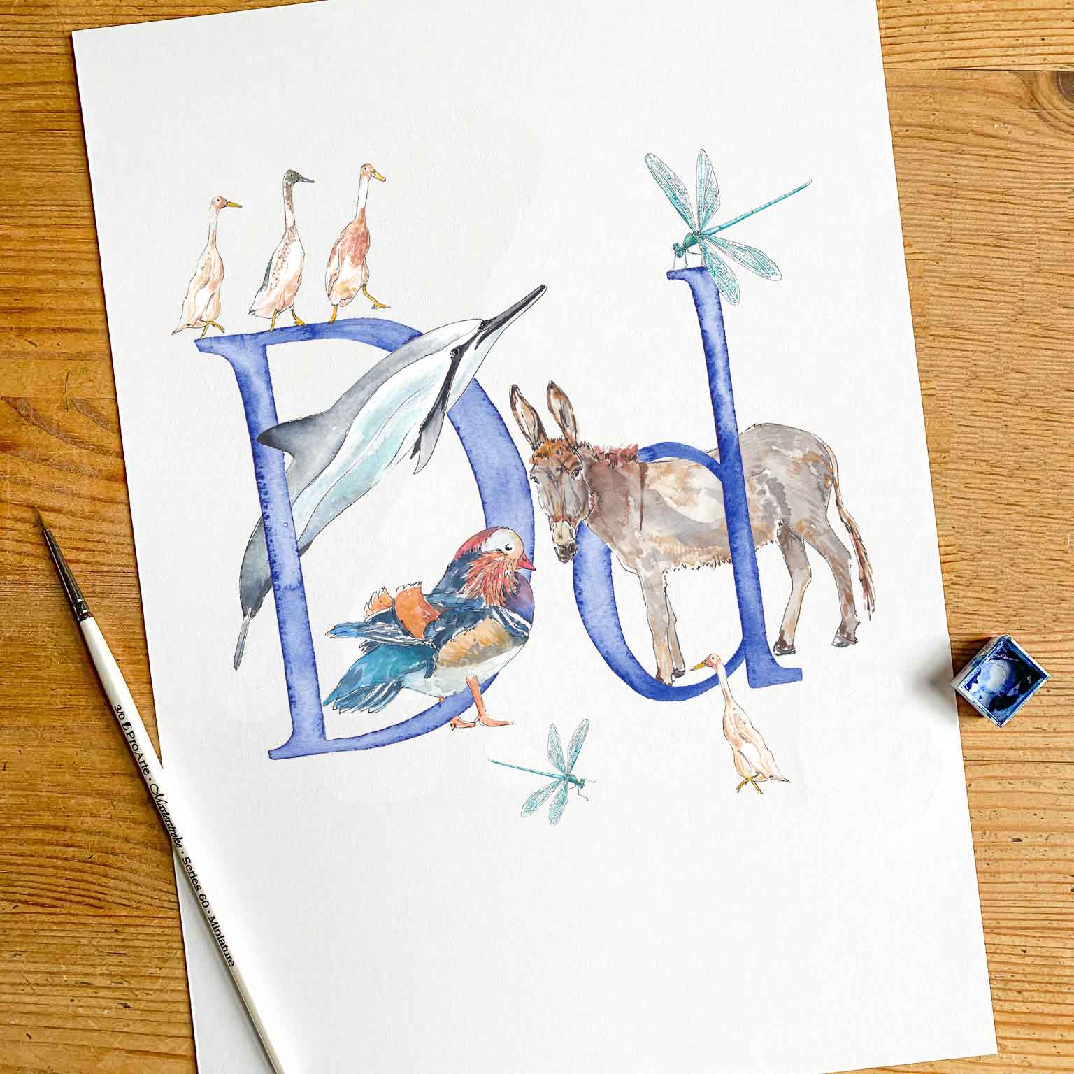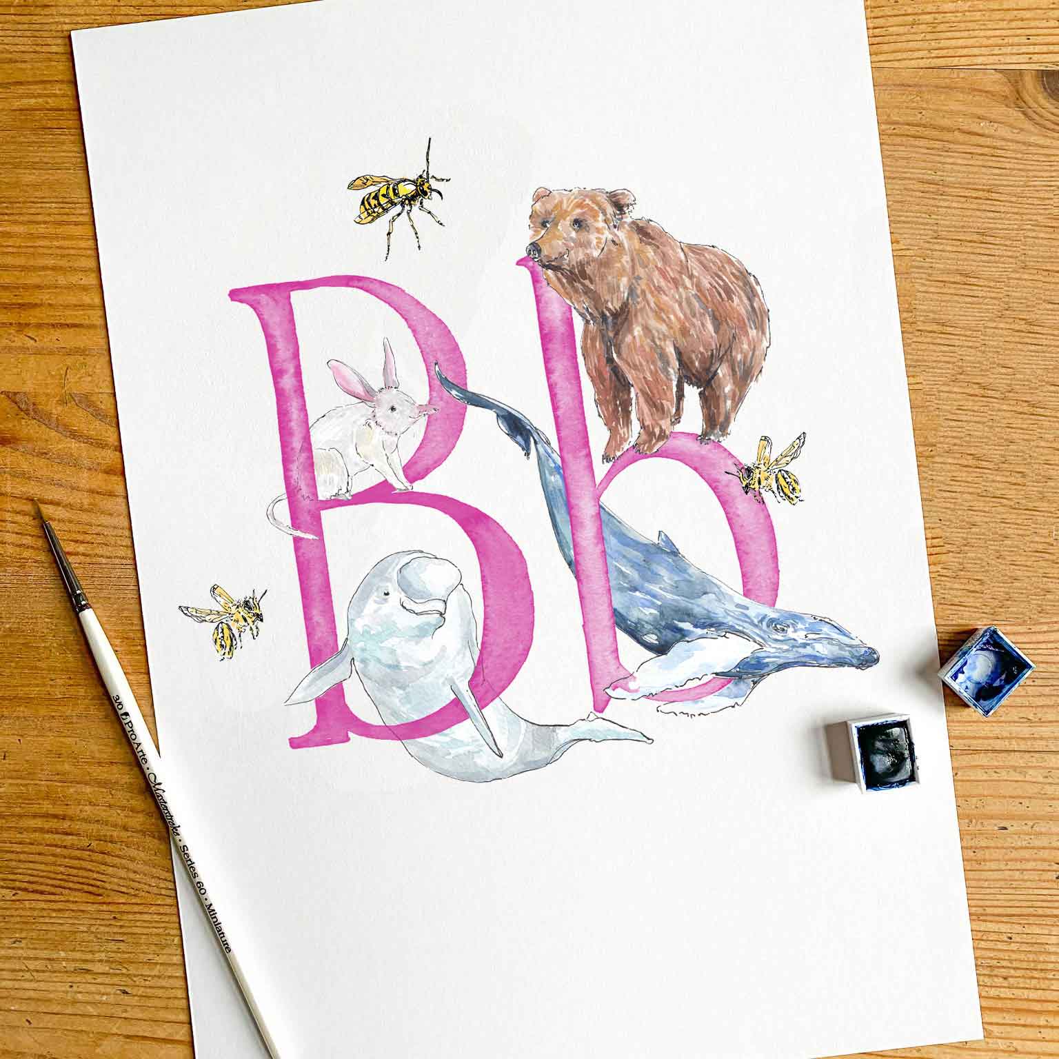 All of the letters are originally hand-painted in watercolour to give a contemporary twist to a classic serif font. There is the choice of five different colours for the letters, in a palette that I’ve chosen specially to let the animals shine through. You can choose the colour you’d like above, and you can see the different options in the images too.