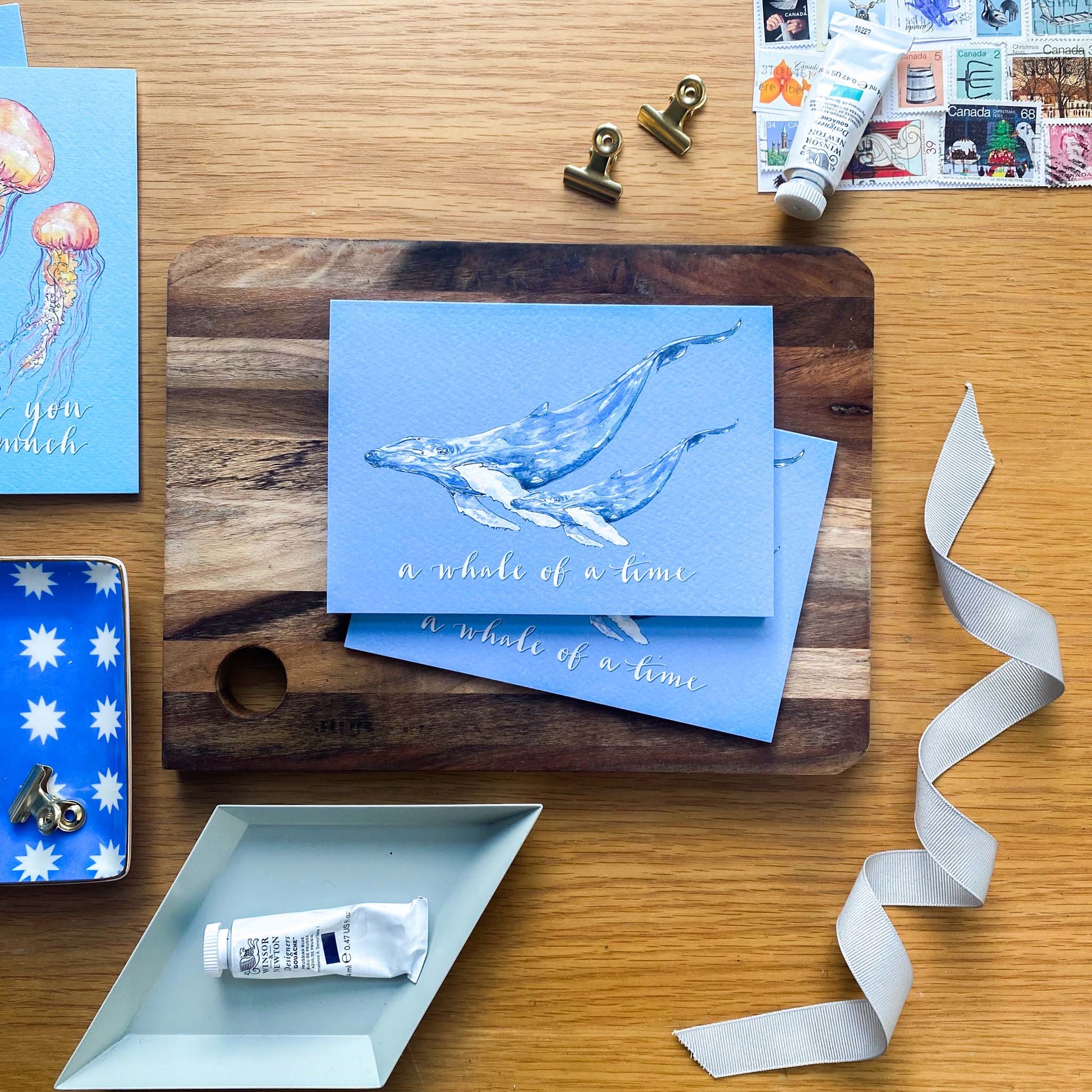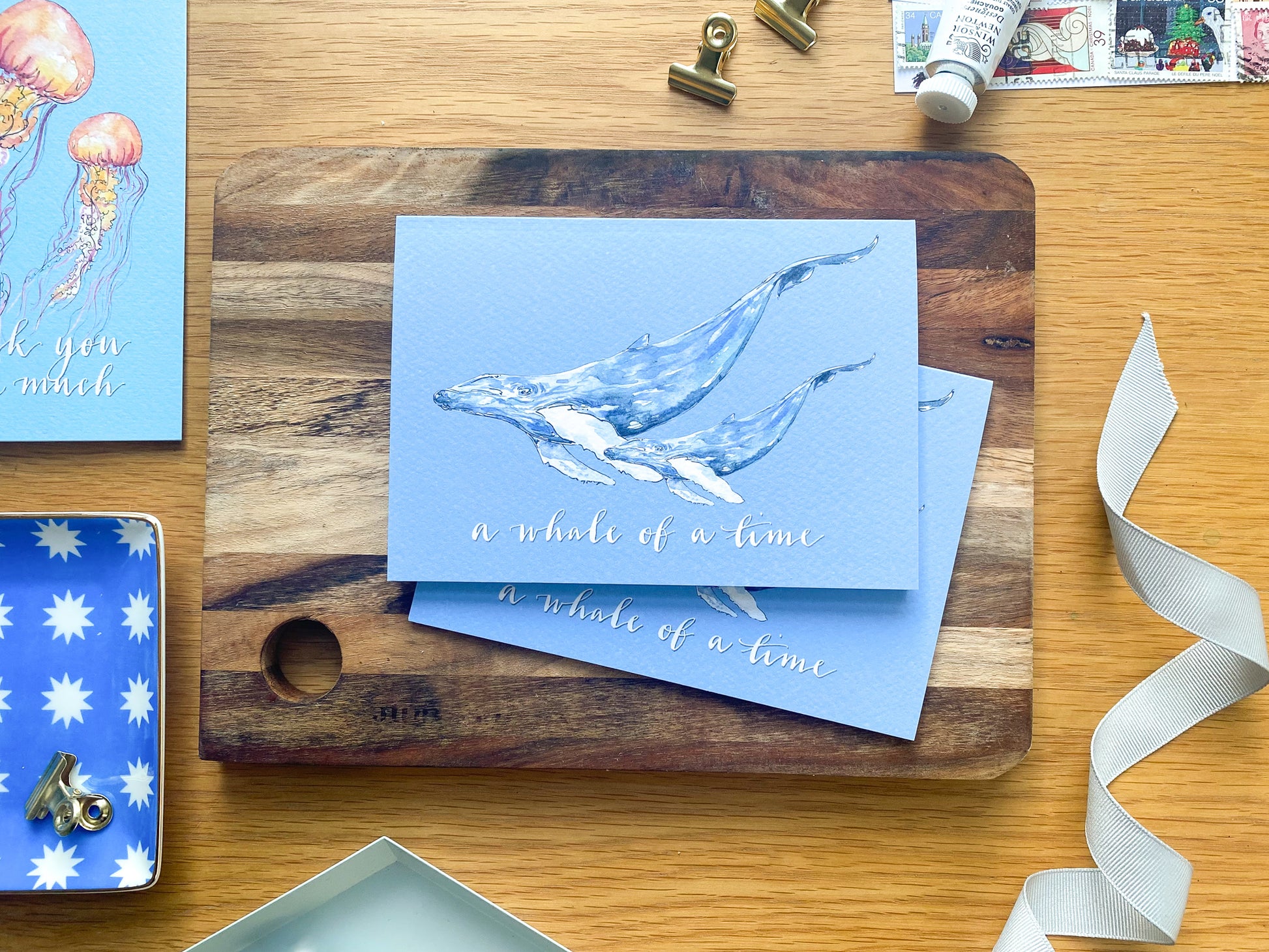 This thank you card combines original illustrations of a blue whale with Polly's handwriting, with the message 'a whale of a time'. The phrase is designed to allow the card to be appropriate for any number of occasions!