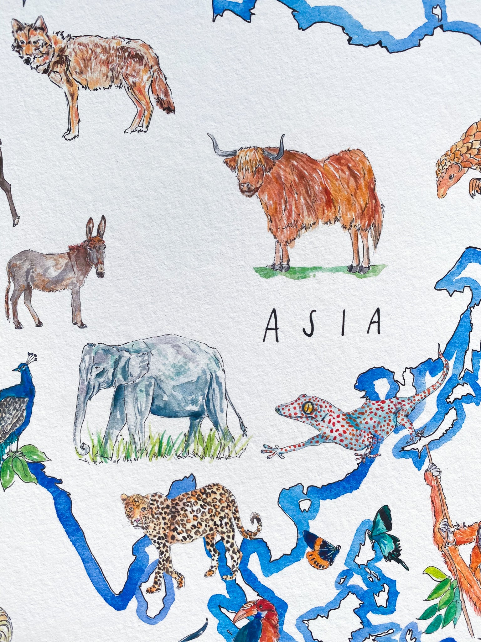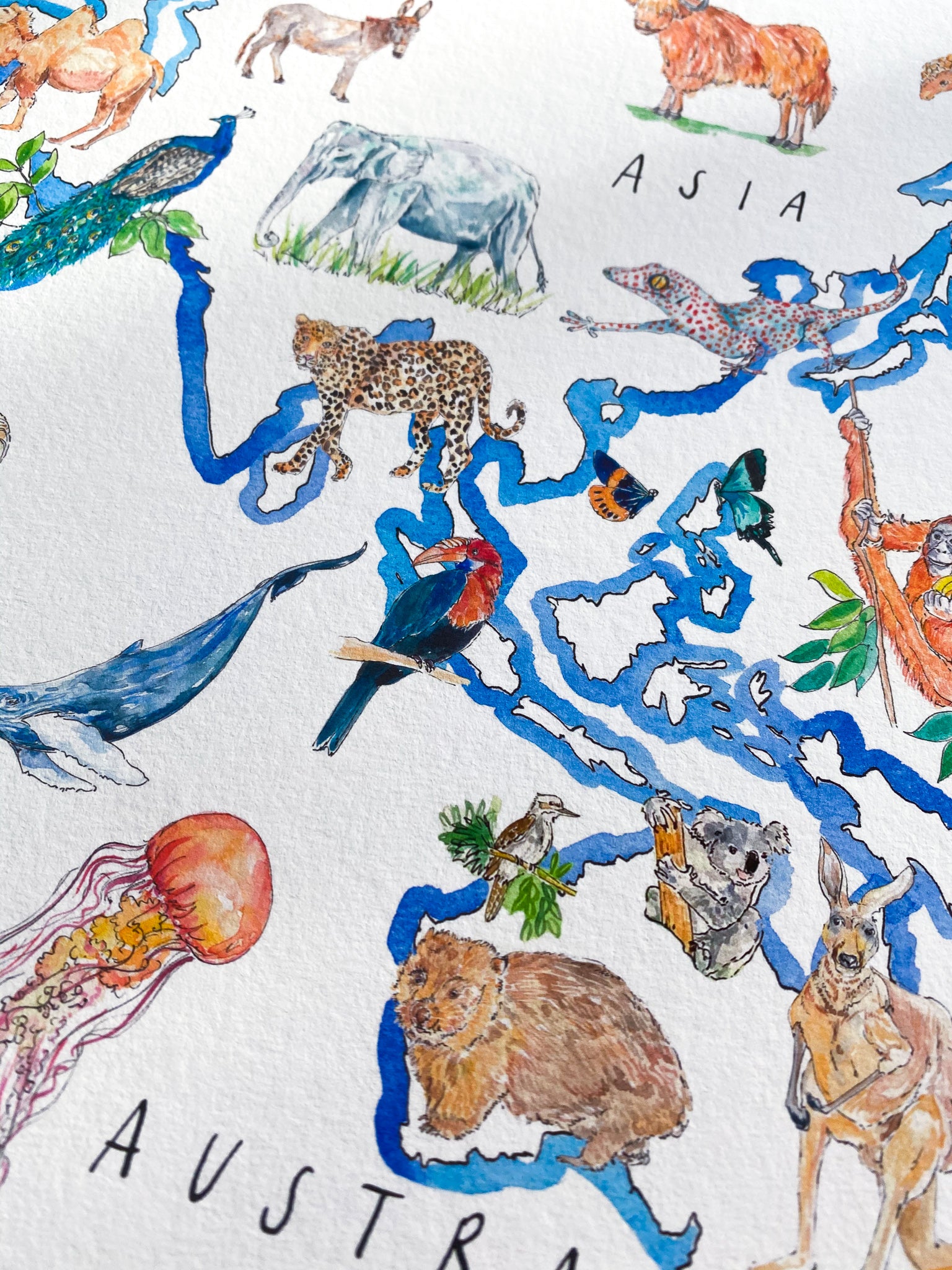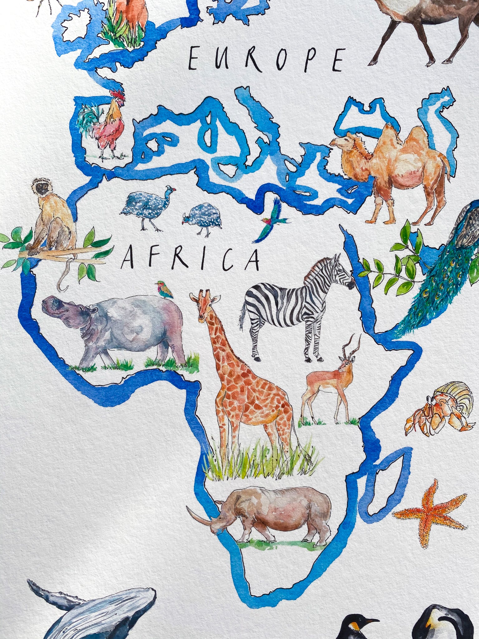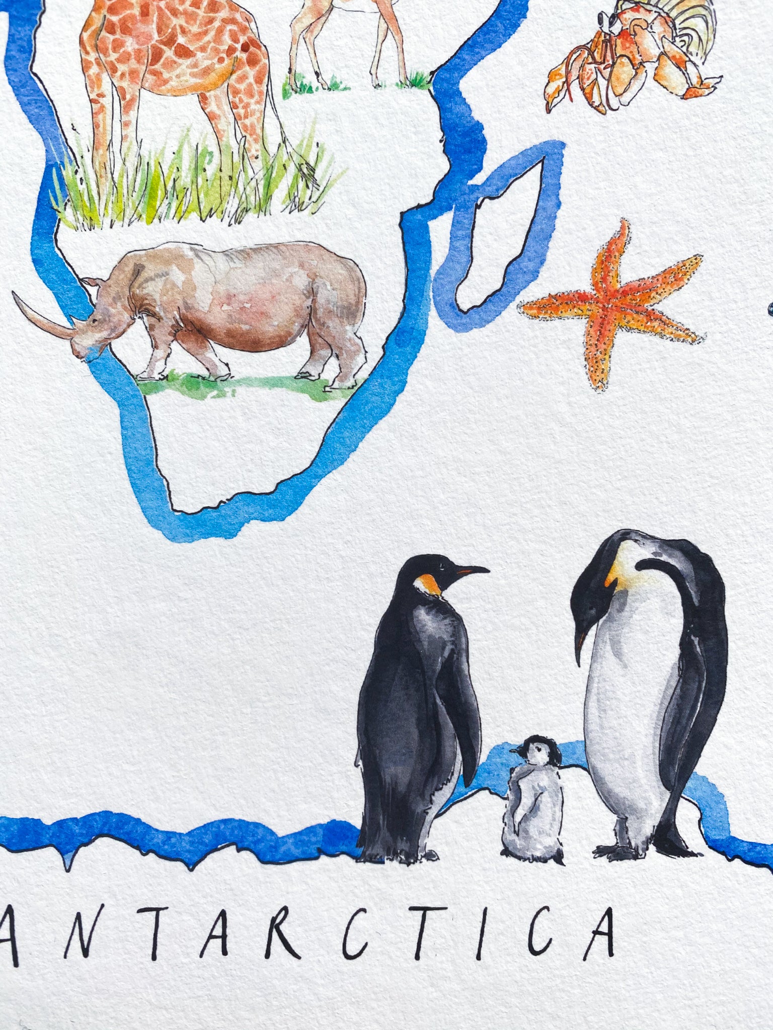 Each animal was originally hand-painted using ink and watercolour, and the world map names each of the seven continents.