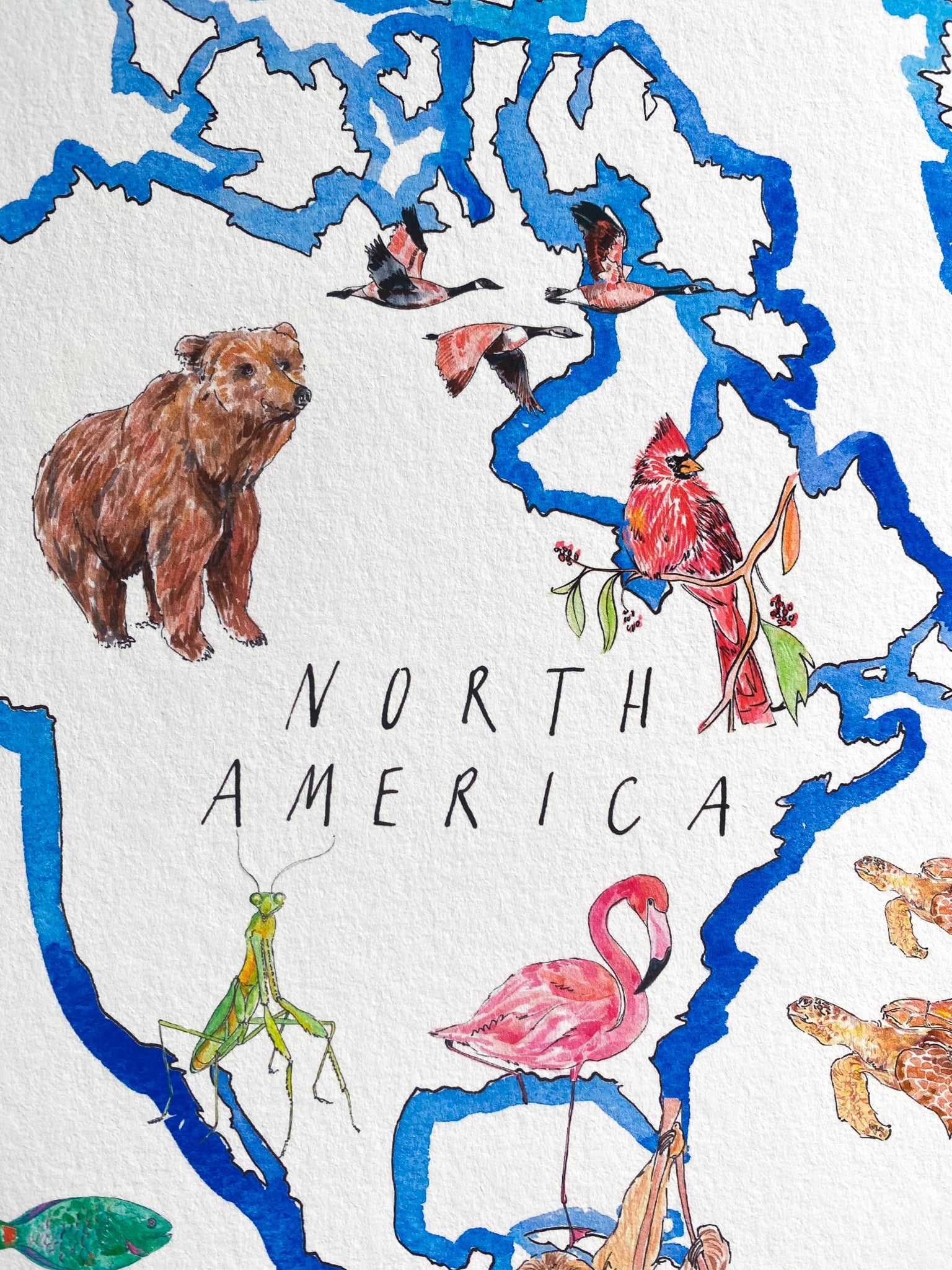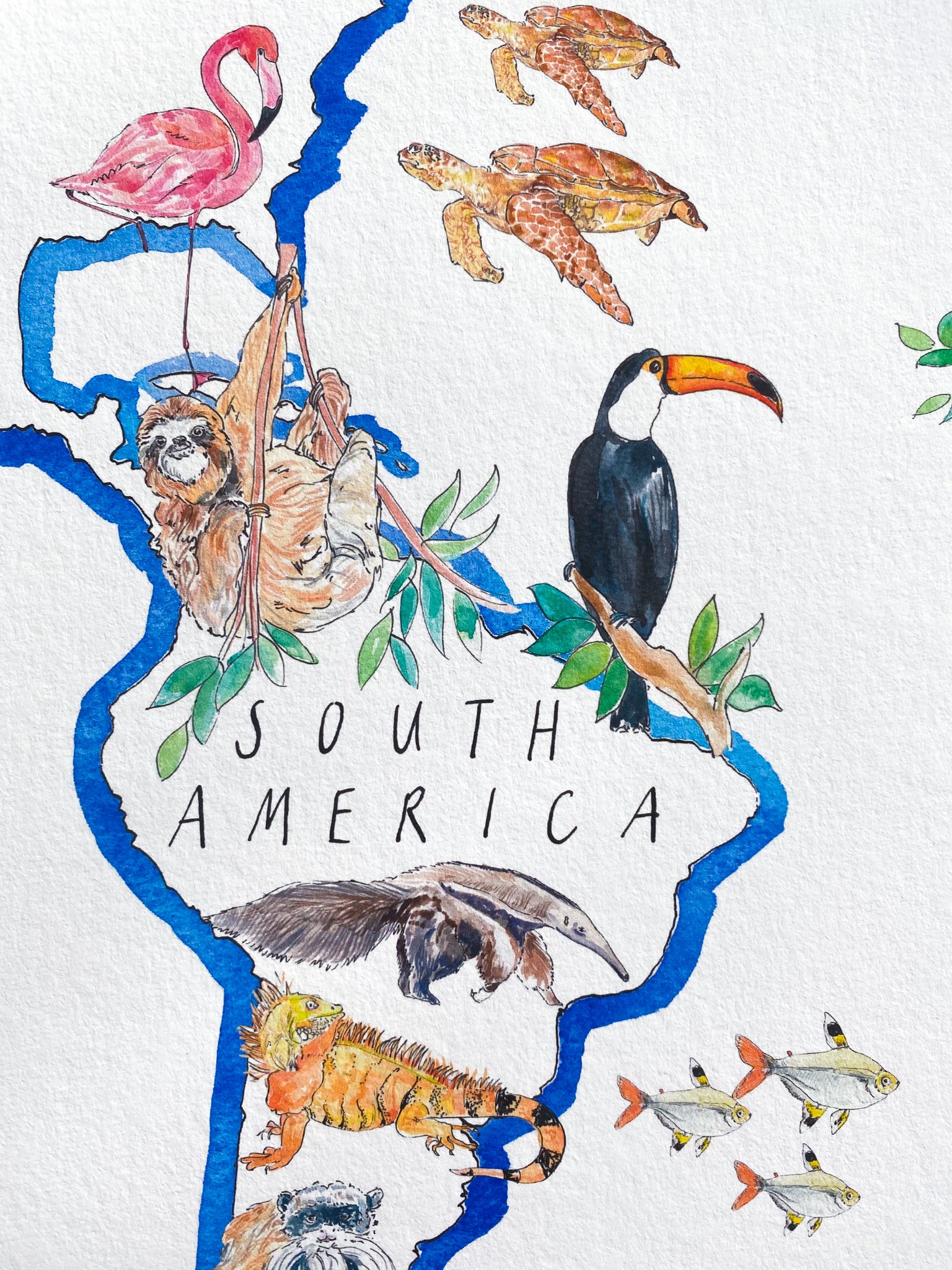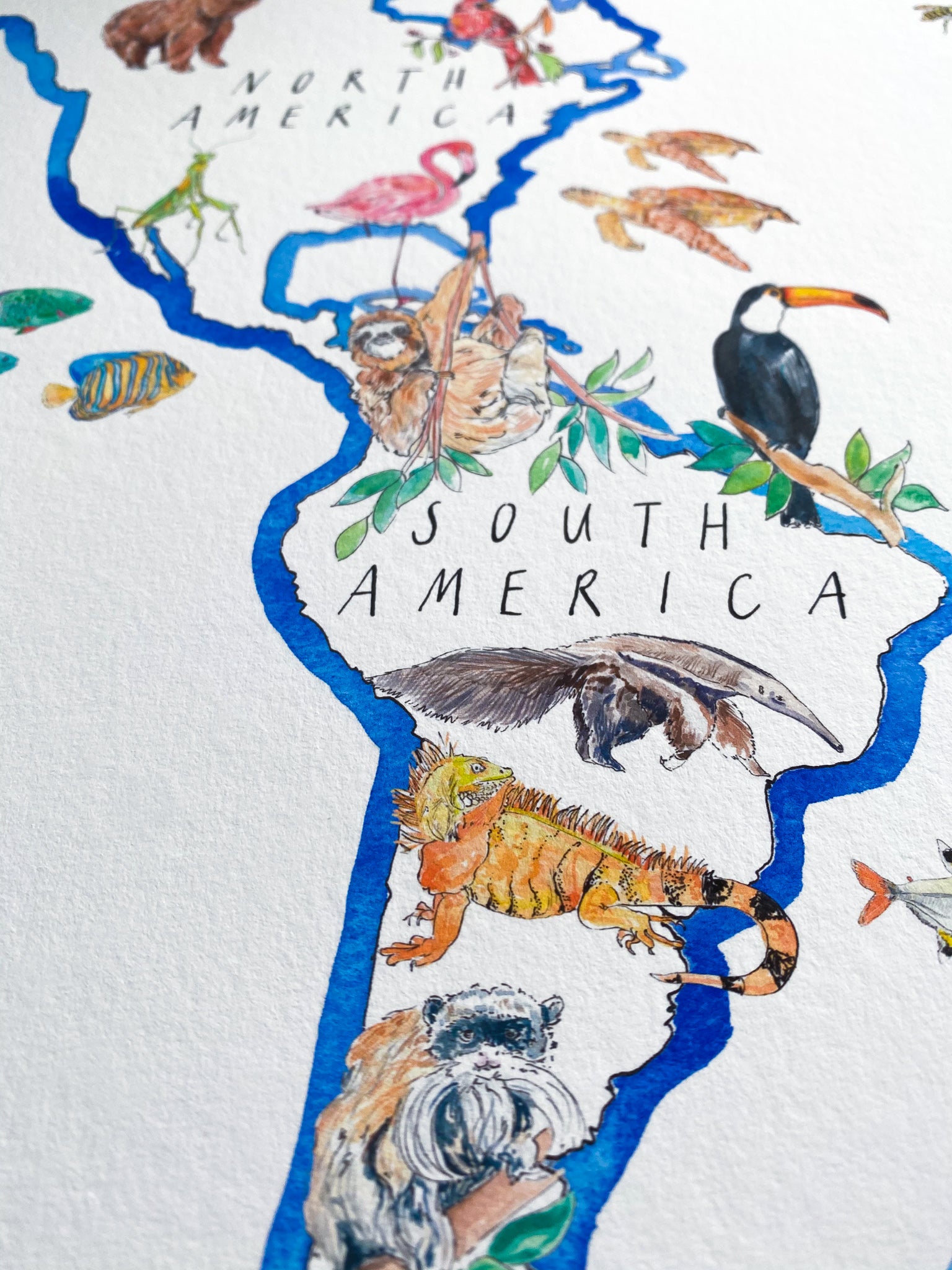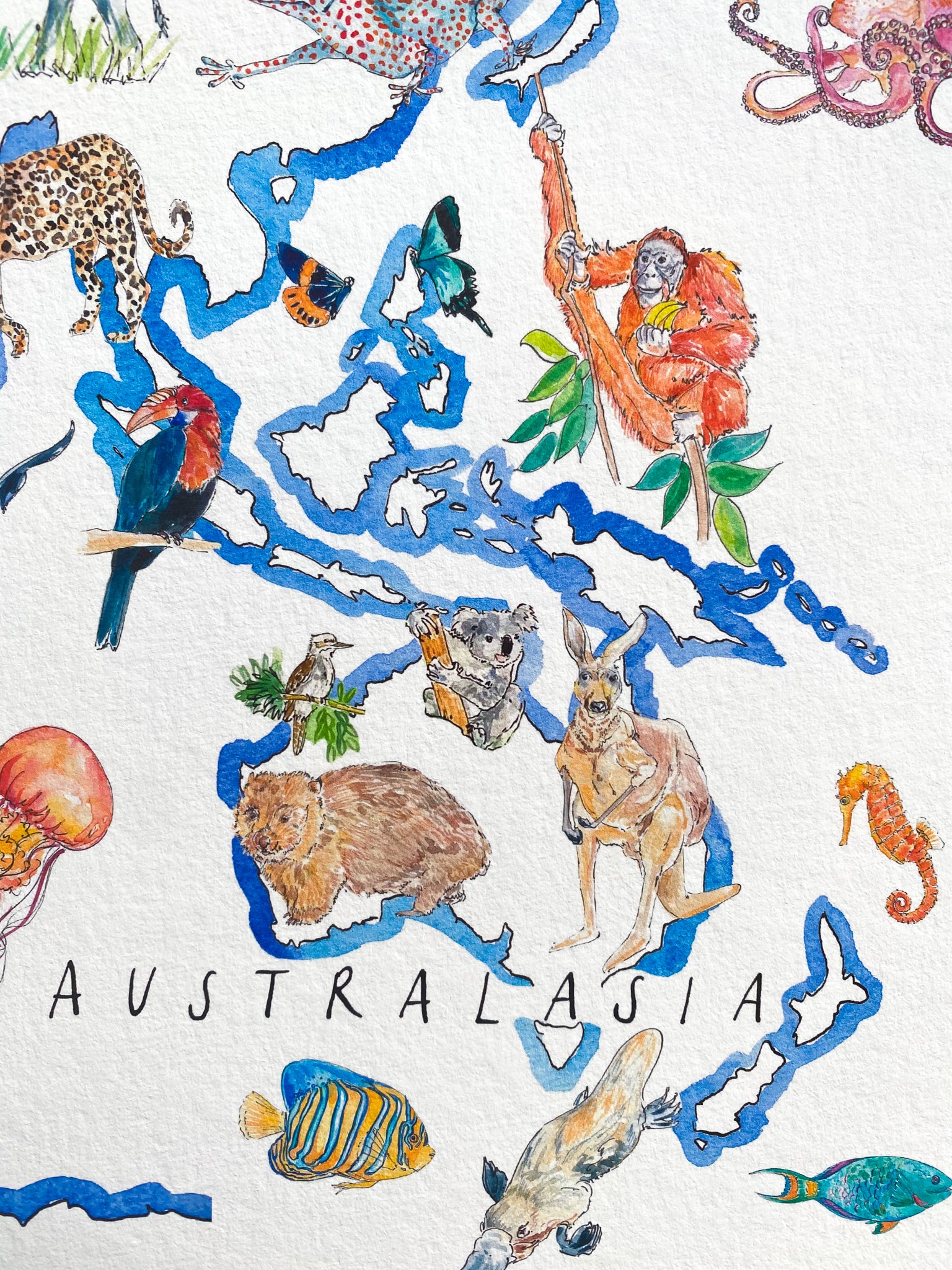 Each animal was originally hand-painted using ink and watercolour, and the world map names each of the seven continents.