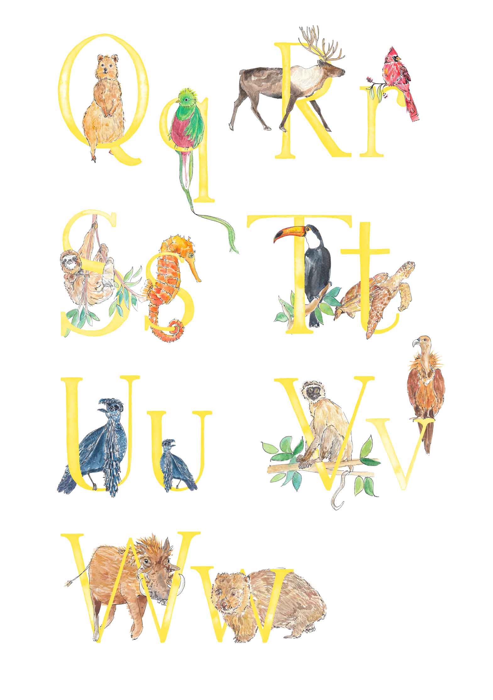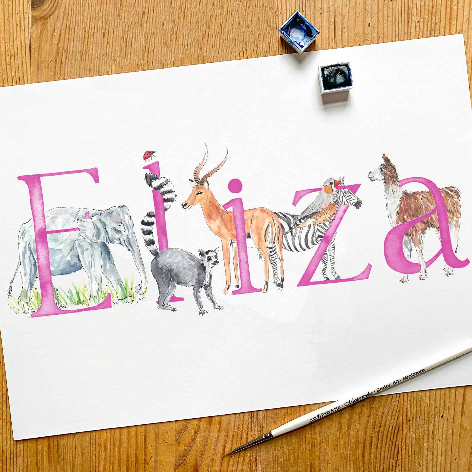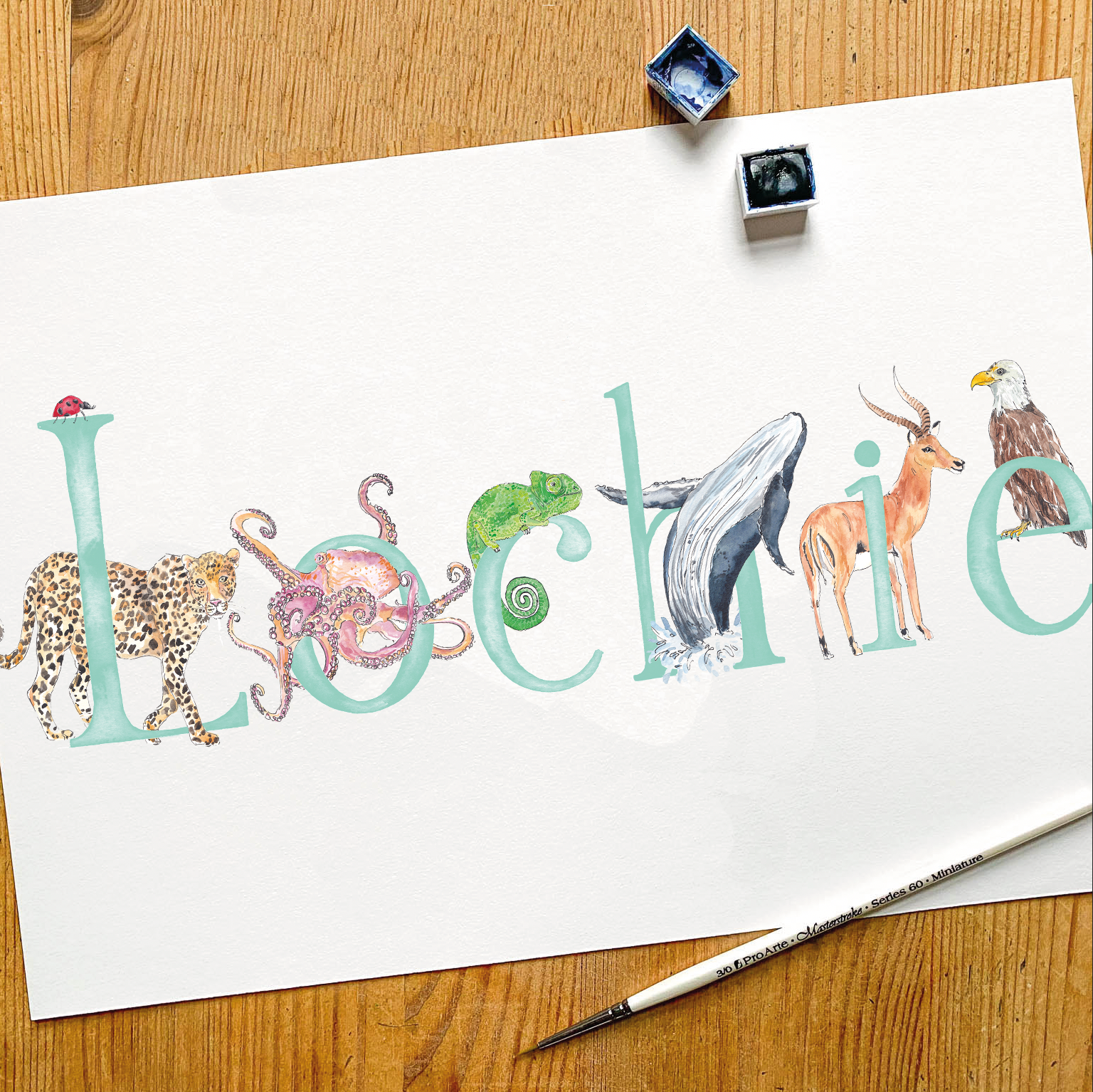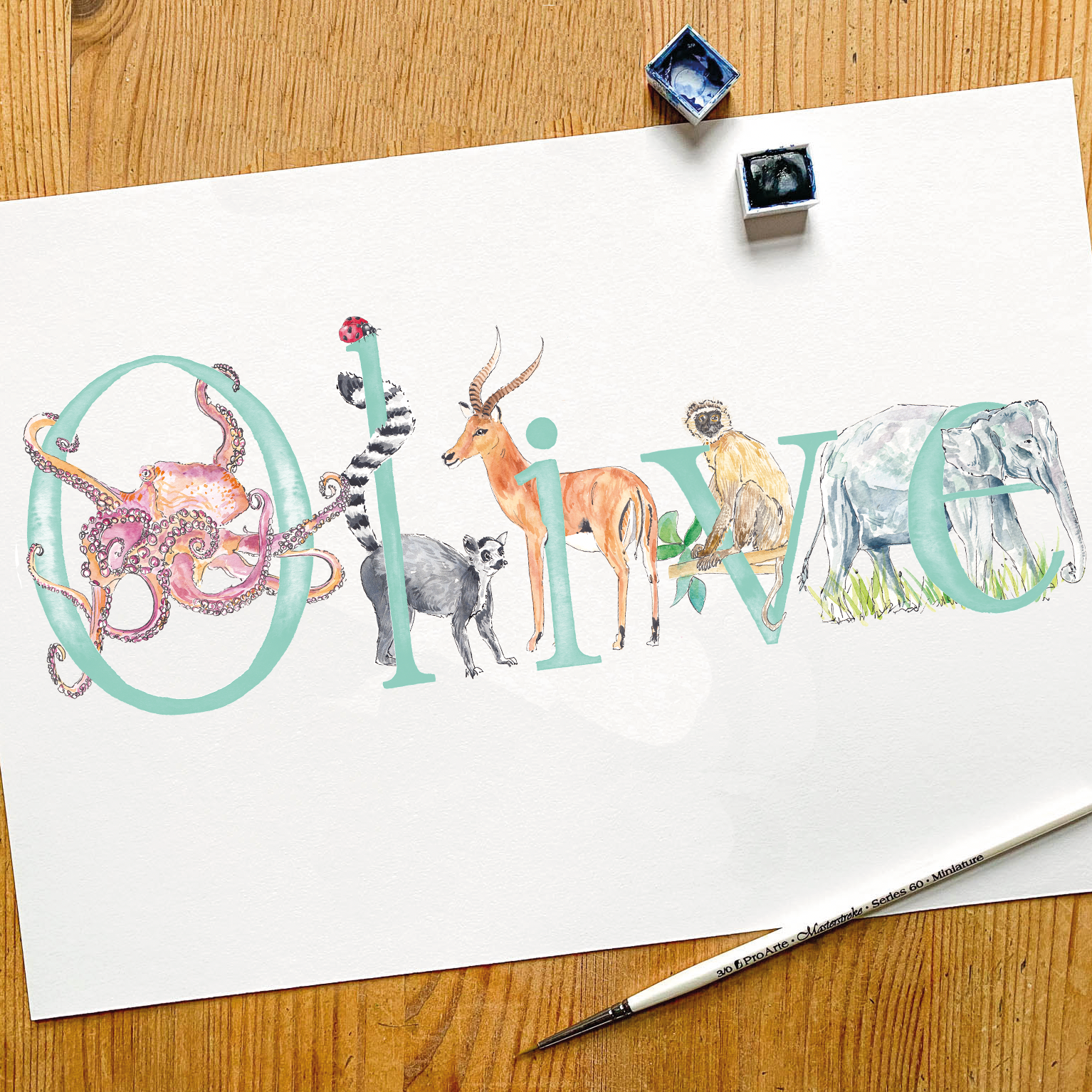 - I will choose the animals to fit each letter, and make sure that the overall composition of the print is balanced, but if you'd like a specific animal that you know I’ve painted, please leave a note (you can do this when you click on basket) and I’ll do my best to include it.