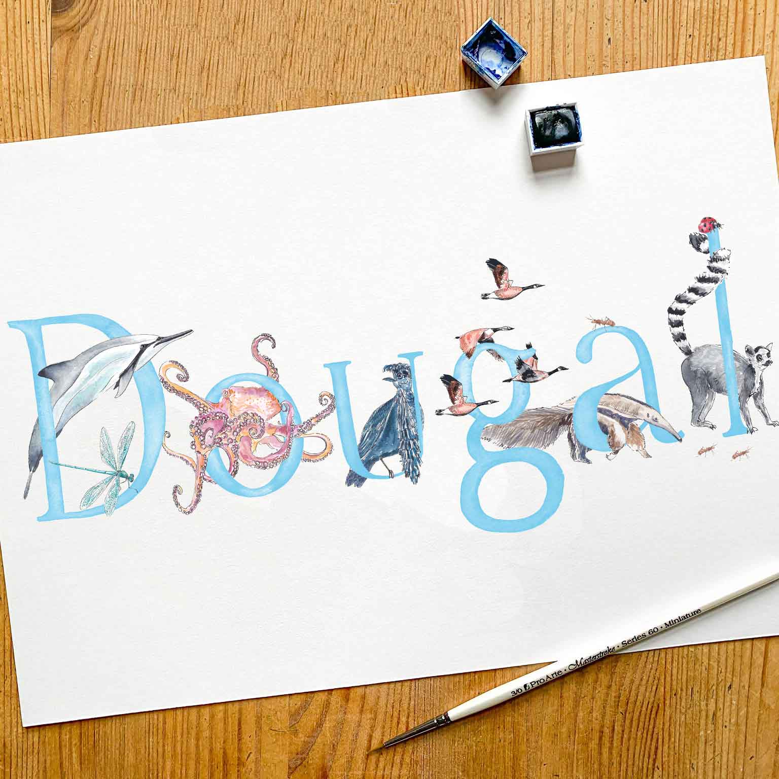 This print will take any name and transform it into a hand-painted name zoo for your wall. Each letter will be paired with a beautiful (and sometimes a little unusual) animal character beginning with the same letter. An octopus for an o… and so on.