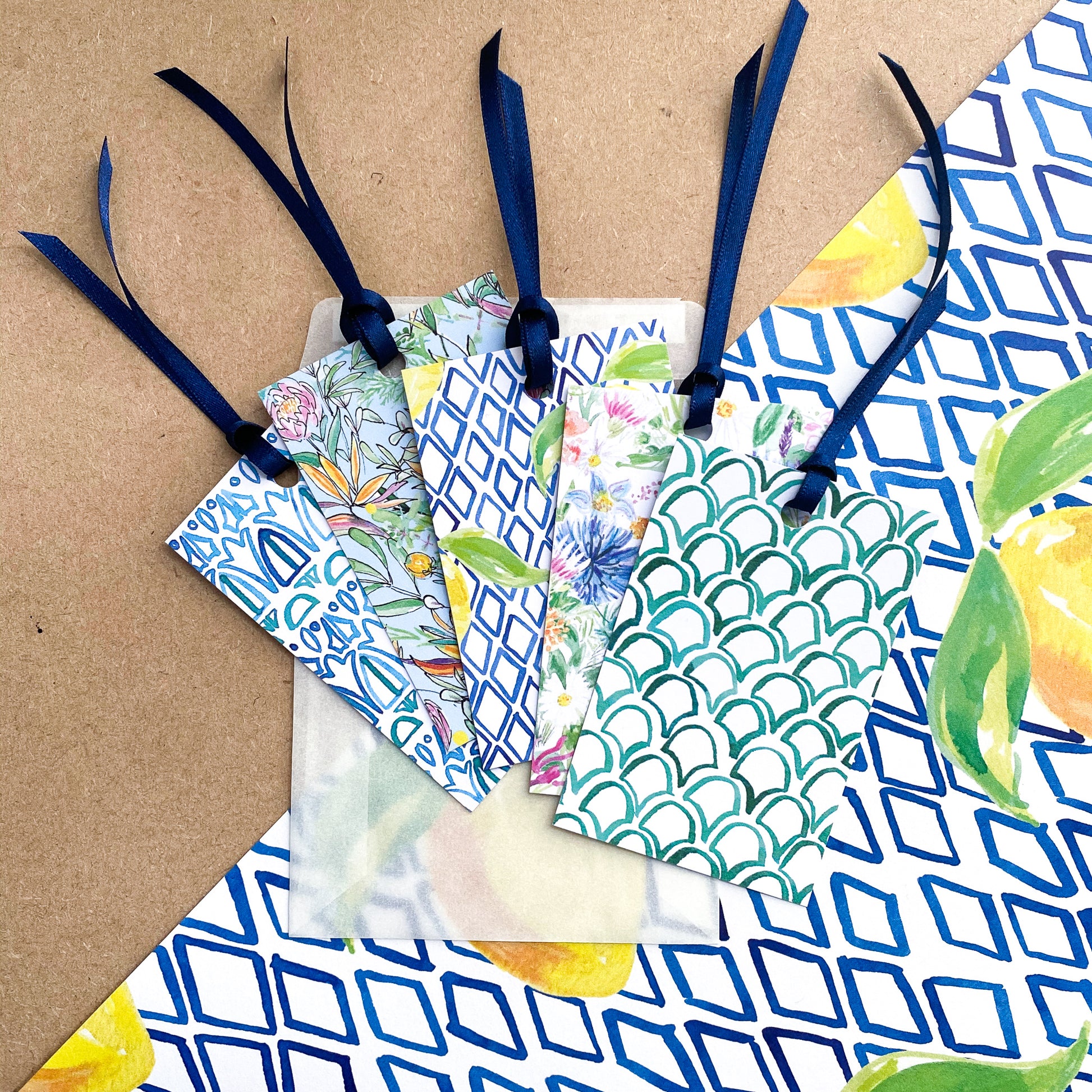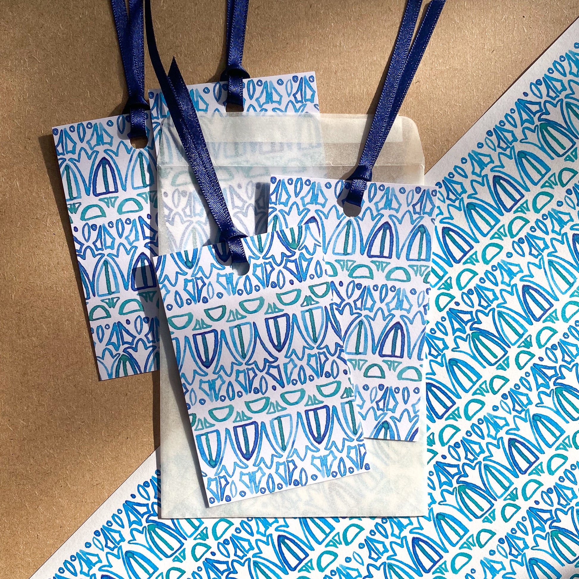 A set of gift-tags featuring a turquoise tile pattern inspired by Portuguese azulejo tiles. The gift tags measure 55x85mm, and are blank on the reverse with plenty of space for a lovely message.