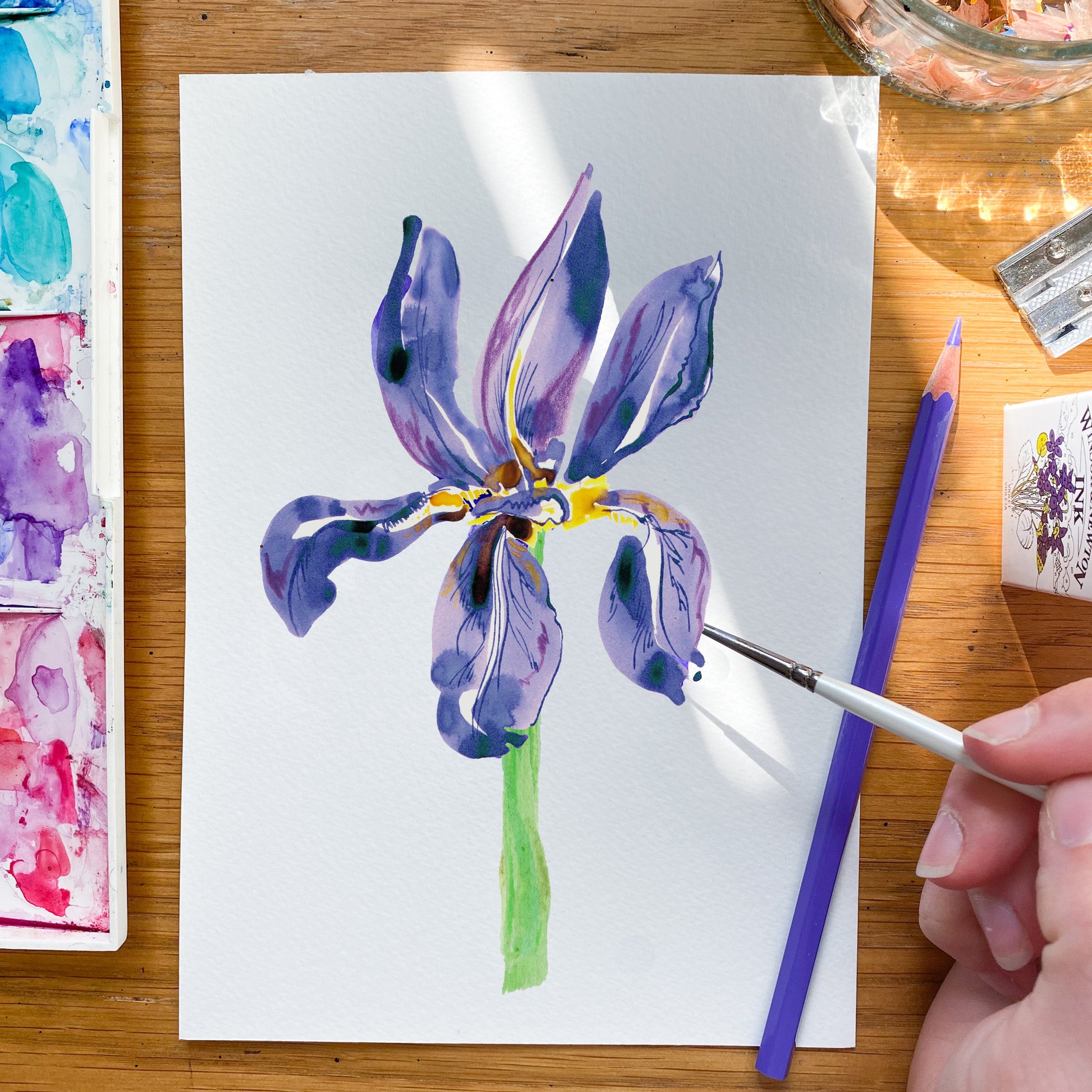 This card was created from an original ink painting of an iris. These paintings were inspired by watching irises come up day by day in Polly’s garden during the UK lockdown in April 2020. Irises are often seen as a symbol of hope, faith and wisdom, and Iris was the Greek Goddess of rainbows; they are the perfect floral symbol for this time.
