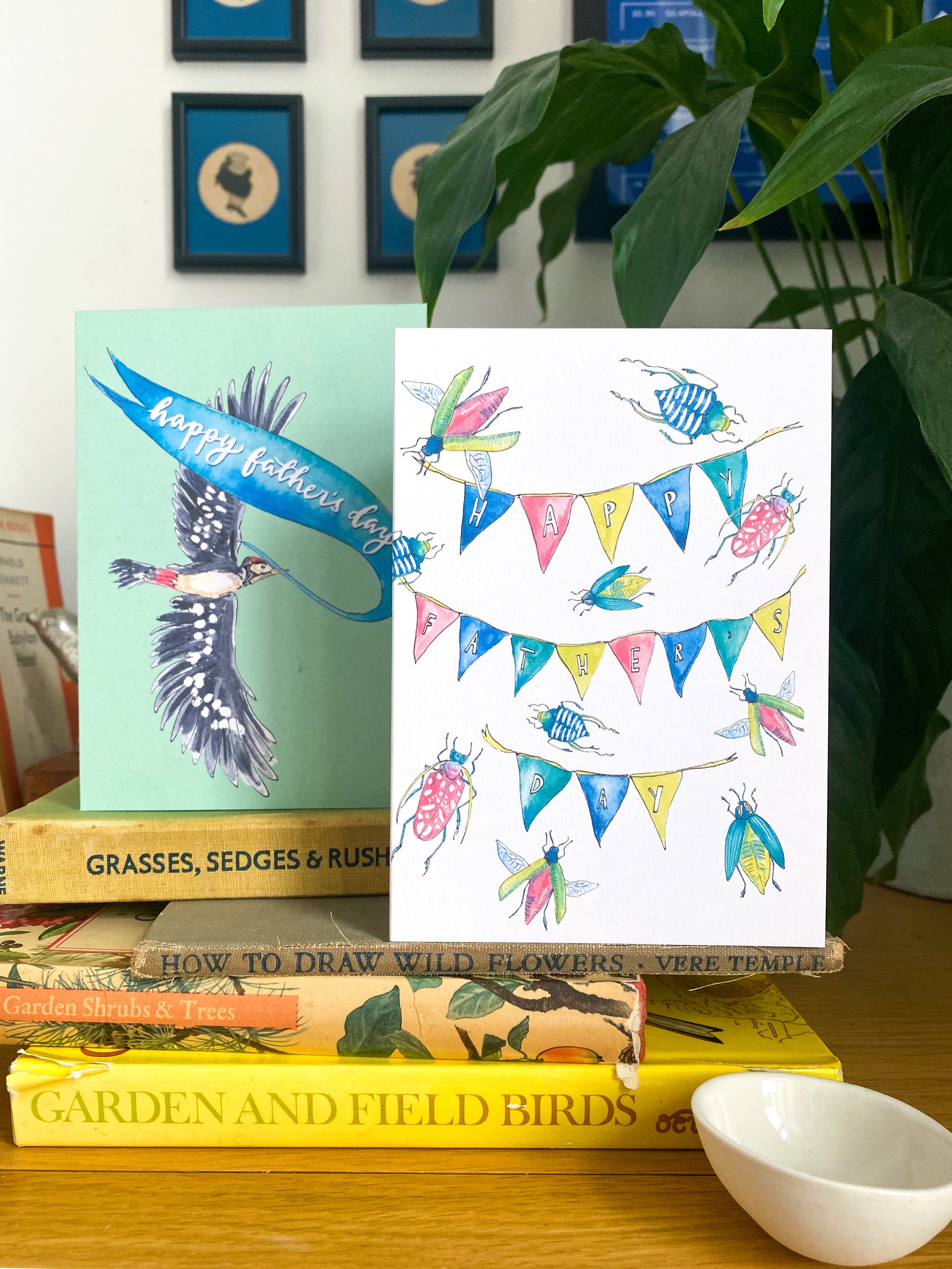 This card is created from original ink and watercolour illustrations of some very fine bugs and bunting to match - perfectly charming for the dad in your life.