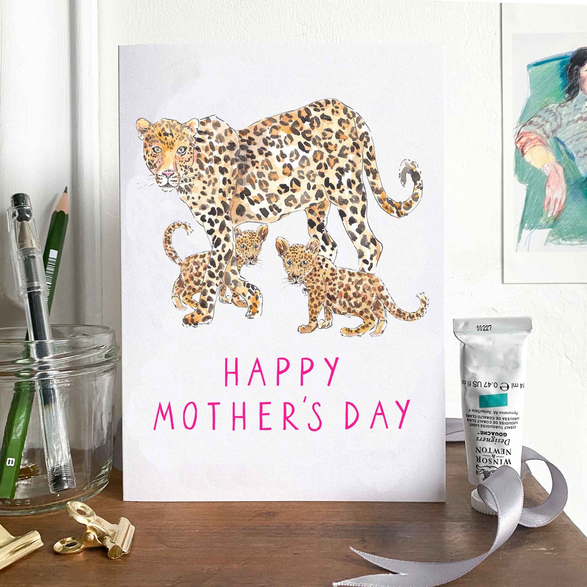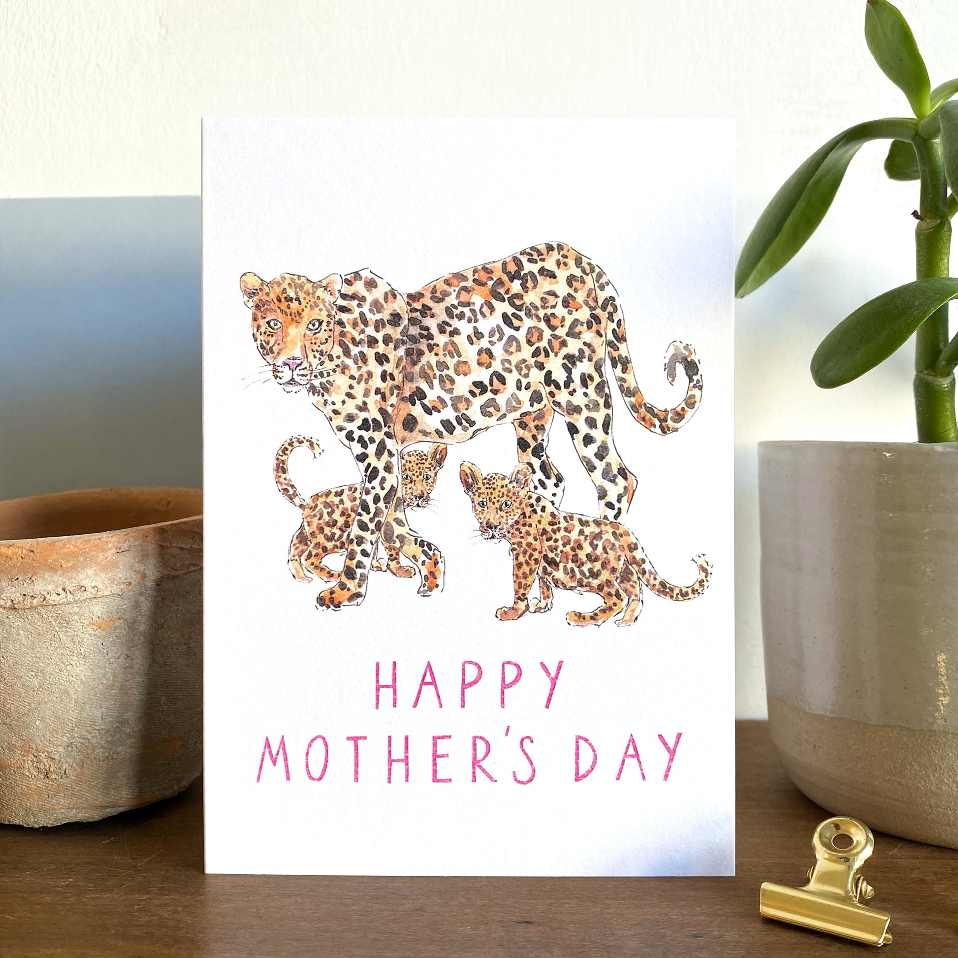 This is the perfect card for keeping it simple but heartfelt on Mother's Day. The hand-painted leopards are perfectly matched with simple hand lettering in a delicious deep cerise colour.