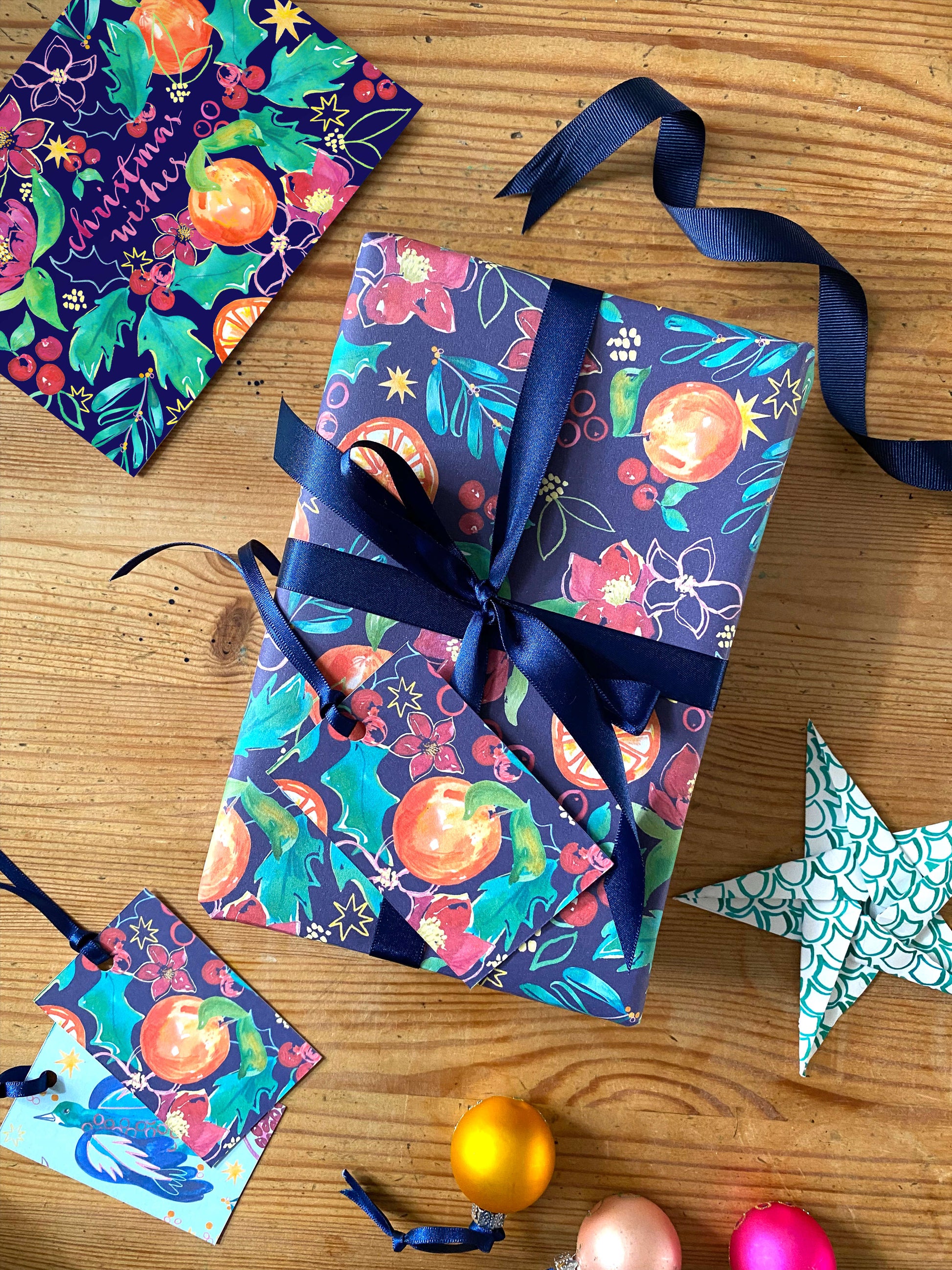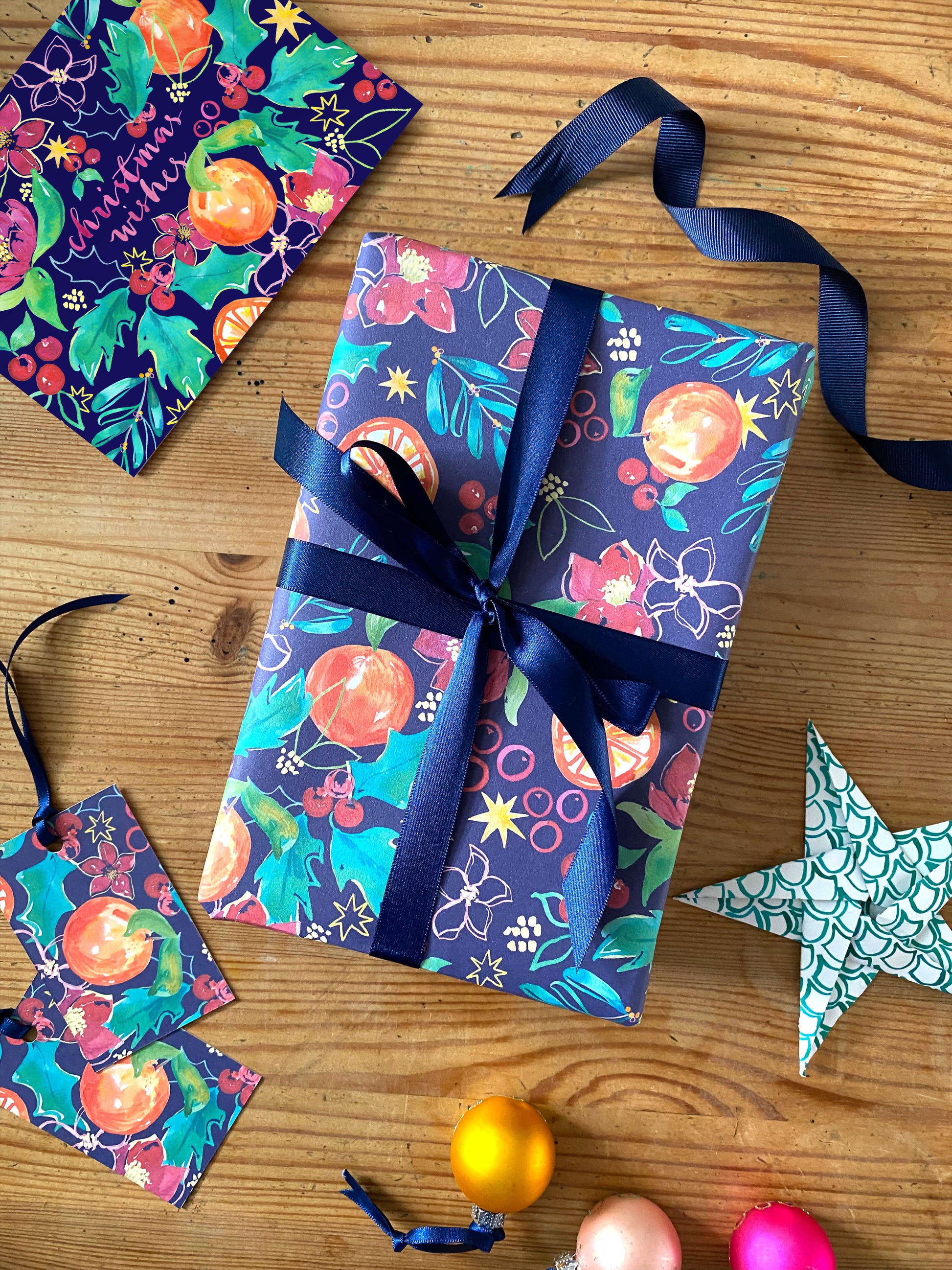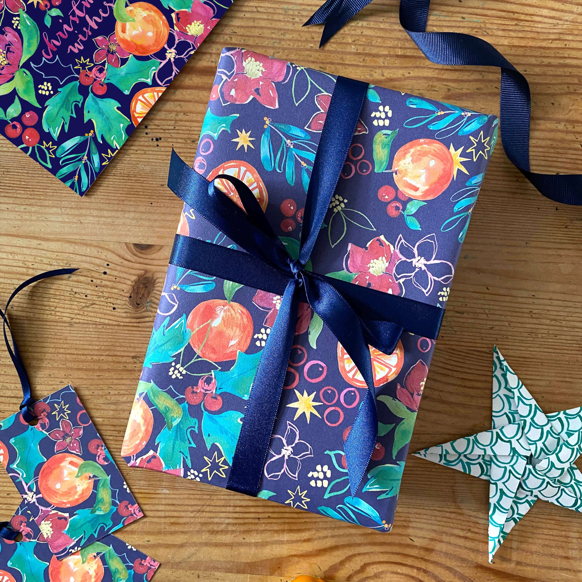 Disappear into the inky depths of this richly patterned wrapping paper, dancing between crimson coloured hellebores, juicy clementines, ripe cranberries, and sprigs of holly and mistletoe.