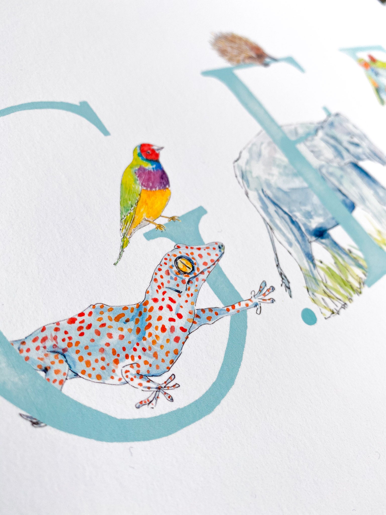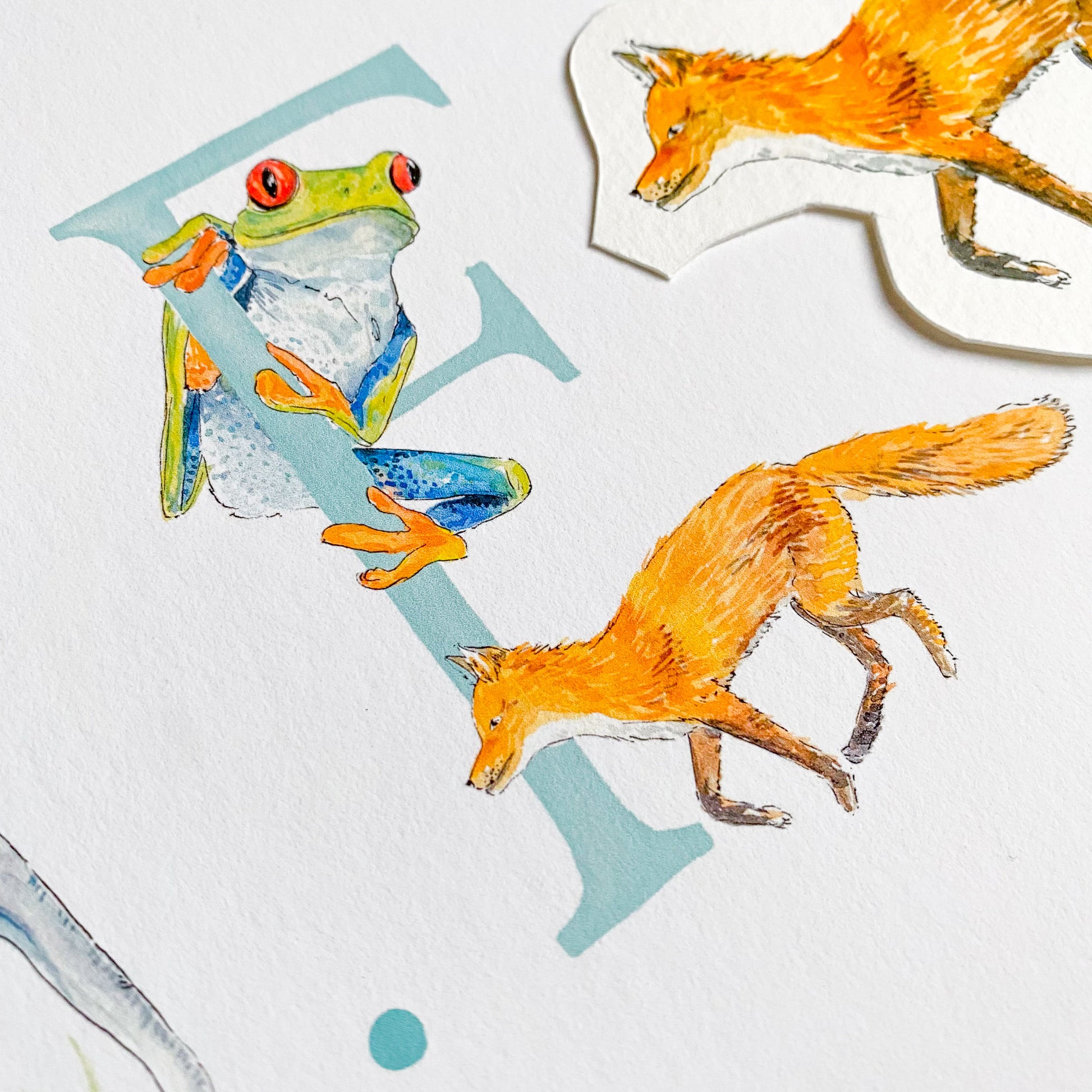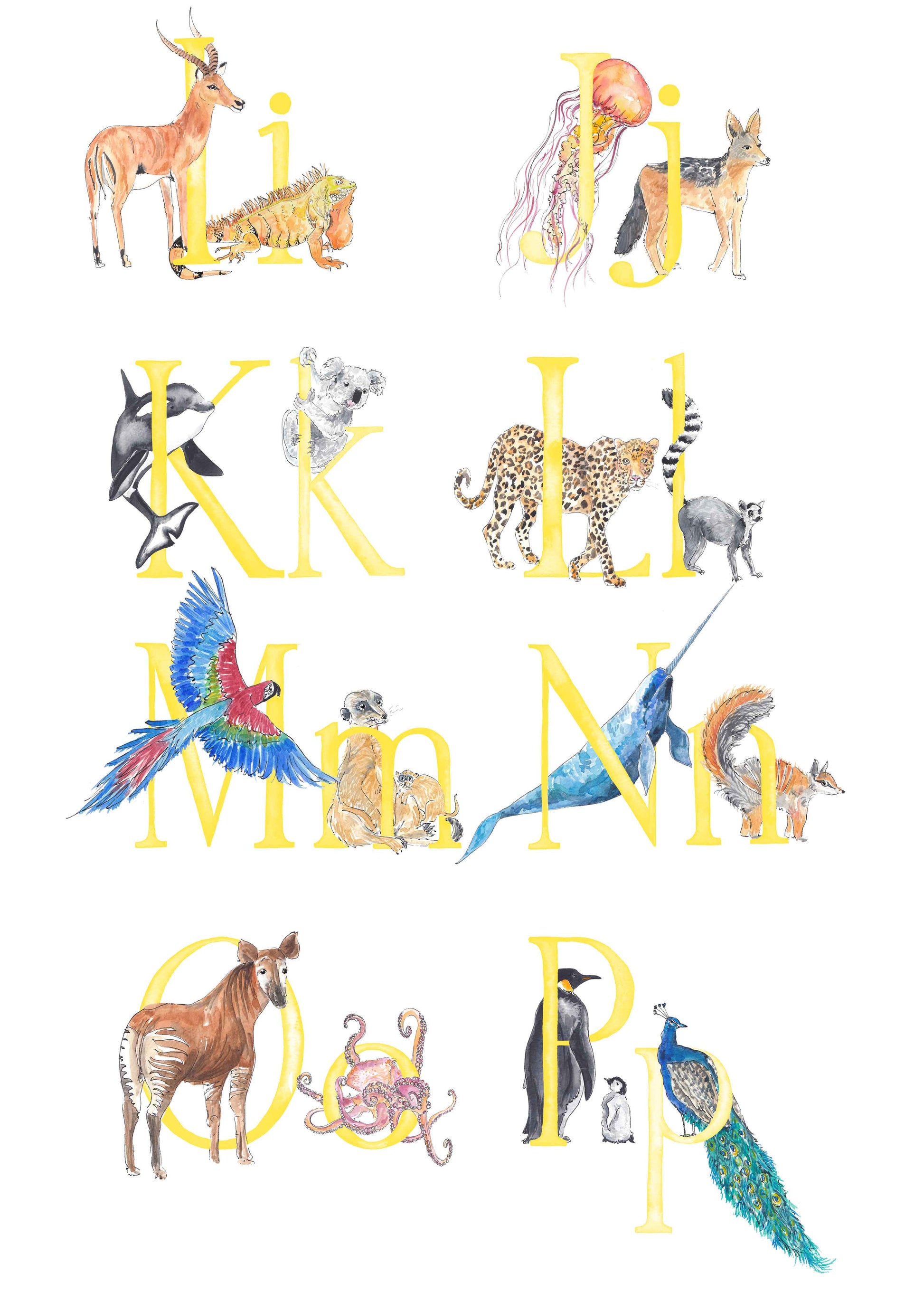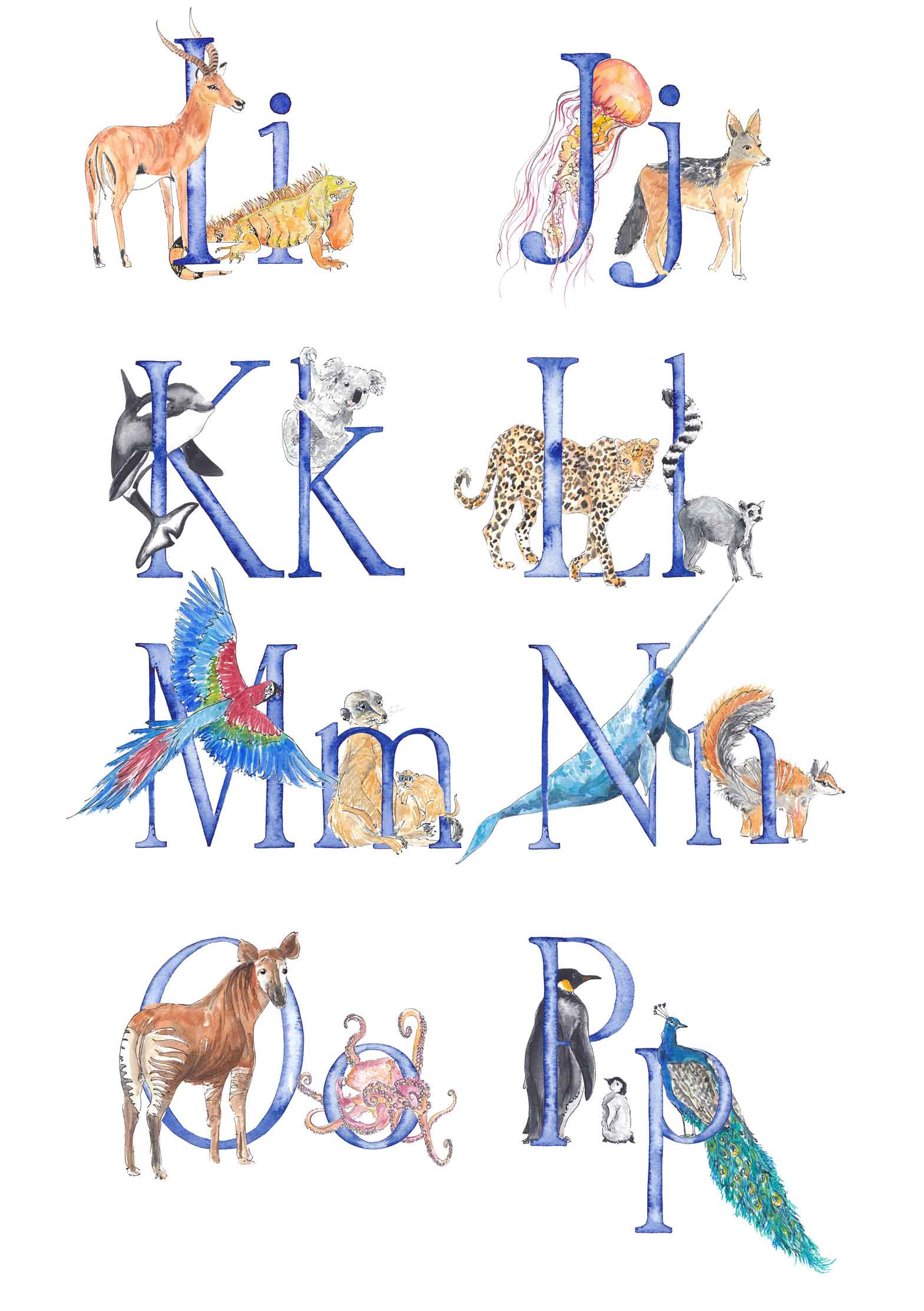 - There will be two animals for each letter - I will choose the animals to fit each letter, and make sure that the overall composition of the print is balanced, but if you'd like a specific animal that you know I’ve painted, please leave a note (you can do this when you click on basket) and I’ll do my best to include it. The animals included in the images are just a suggestion - these aren't final