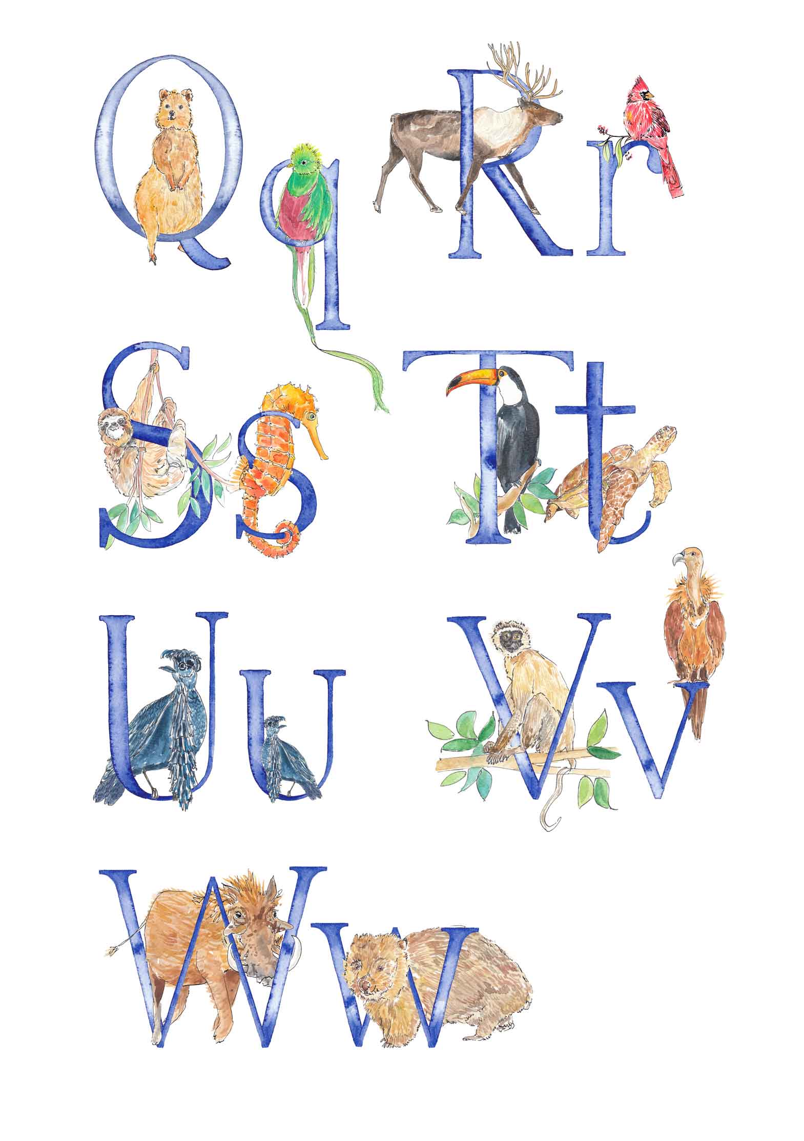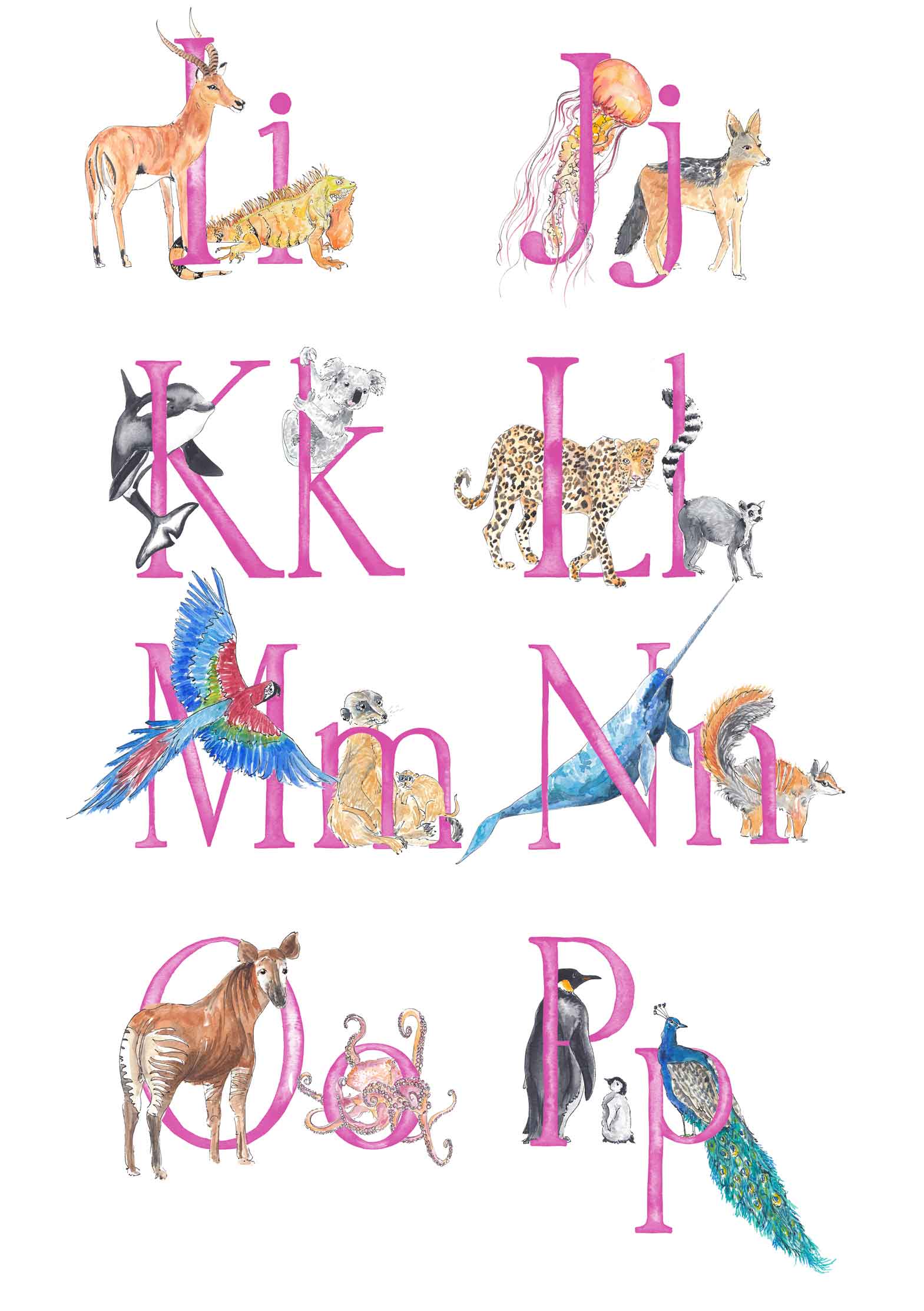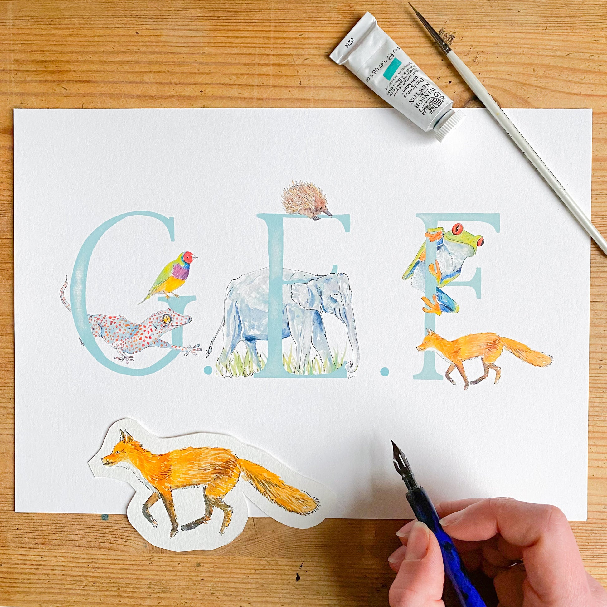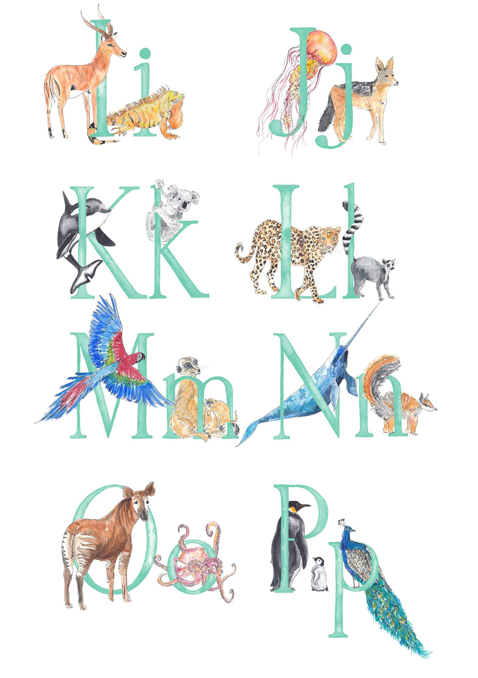 - There will be two animals for each letter - I will choose the animals to fit each letter, and make sure that the overall composition of the print is balanced, but if you'd like a specific animal that you know I’ve painted, please leave a note (you can do this when you click on basket) and I’ll do my best to include it. The animals included in the images are just a suggestion - these aren't final