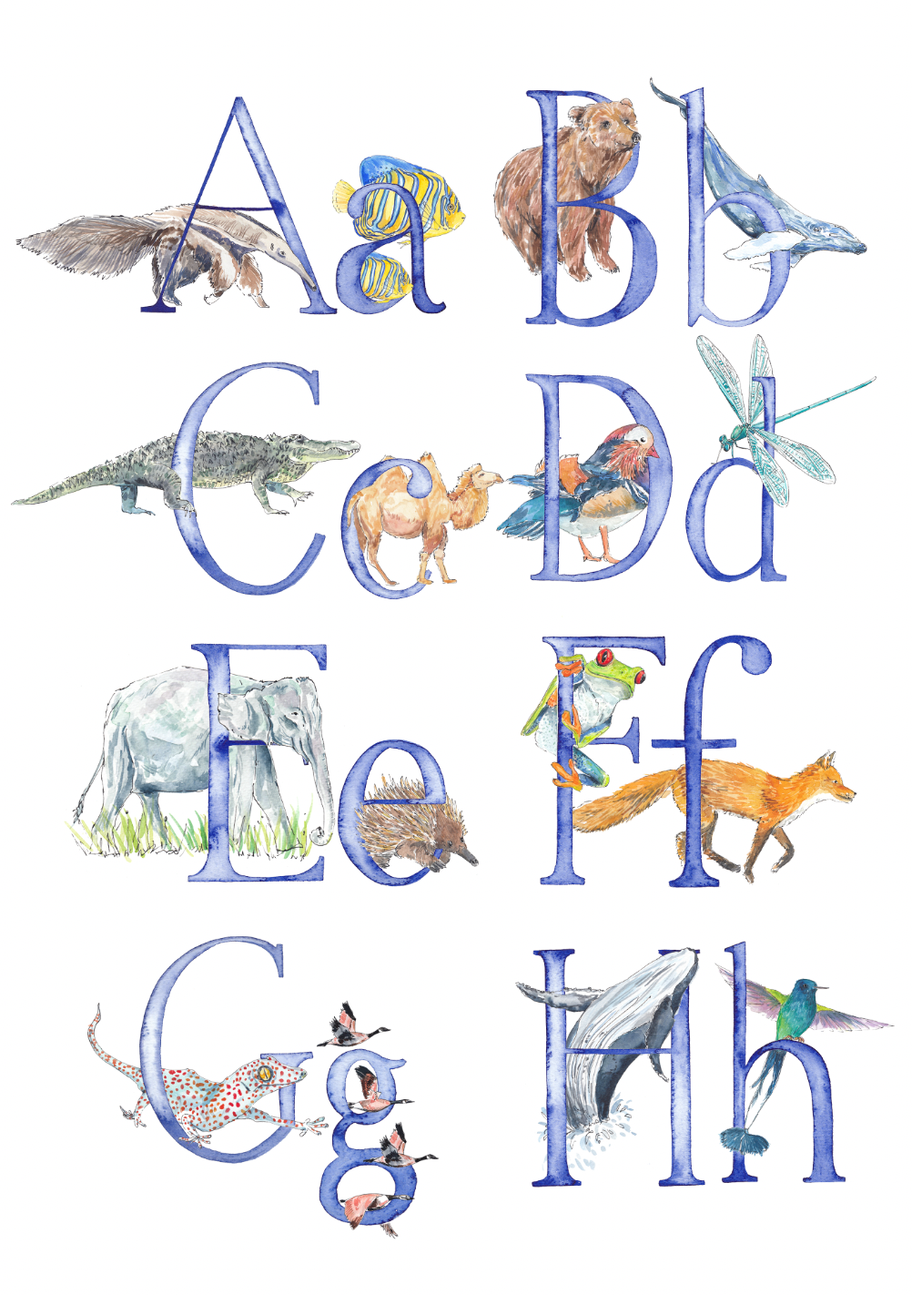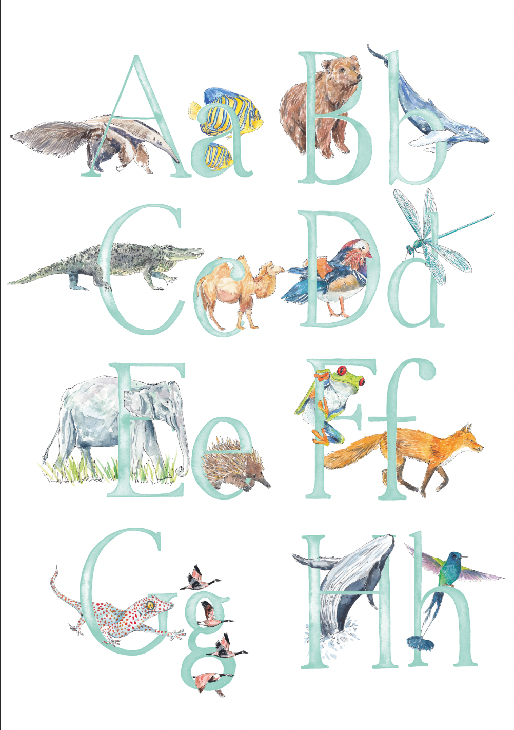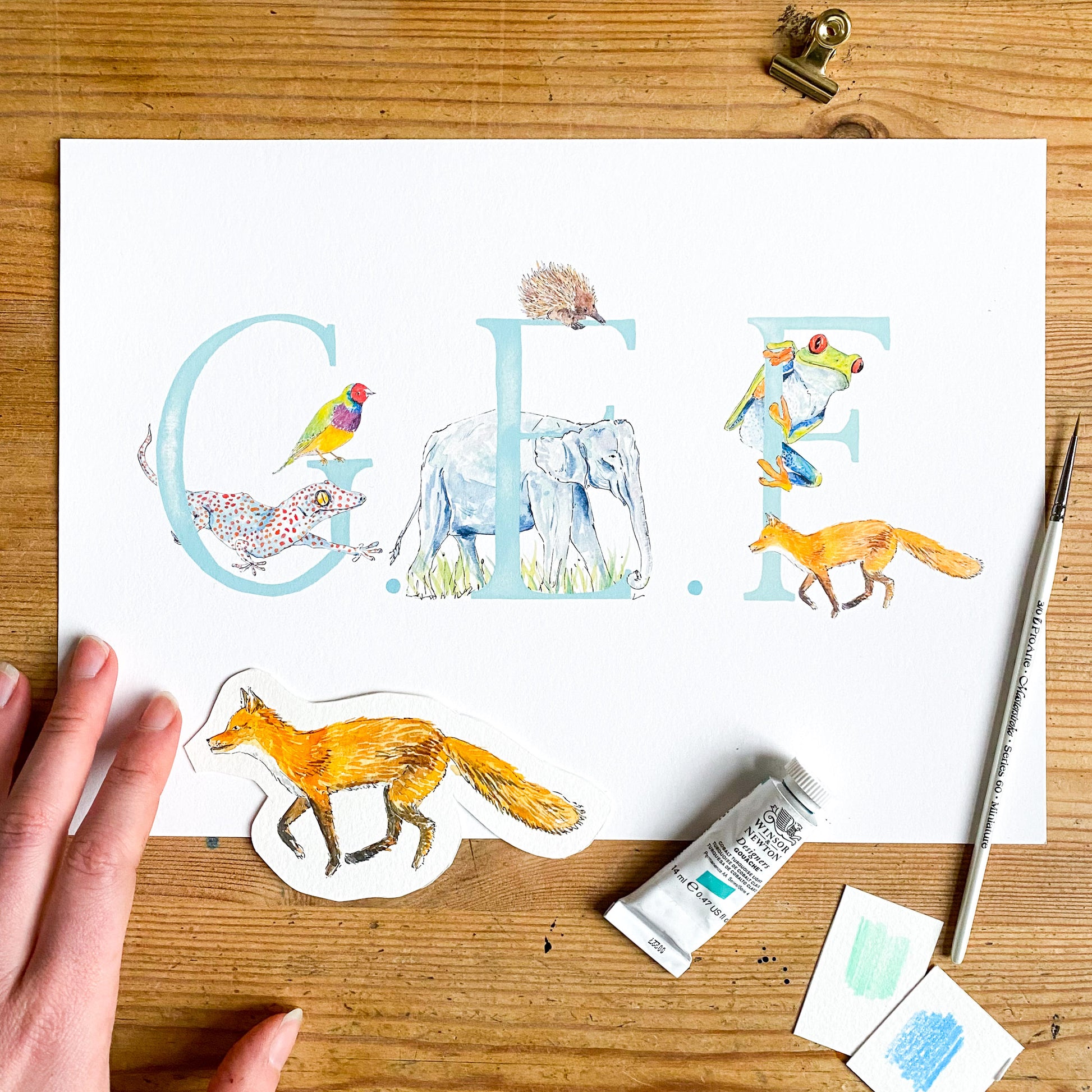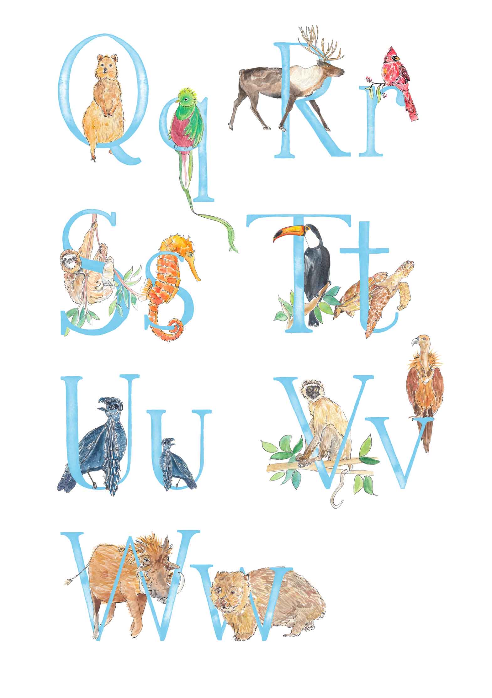 - There will be two animals for each letter - I will choose the animals to fit each letter, and make sure that the overall composition of the print is balanced, but if you'd like a specific animal that you know I’ve painted, please leave a note (you can do this when you click on basket) and I’ll do my best to include it. The animals included in the images are just a suggestion - these aren't final