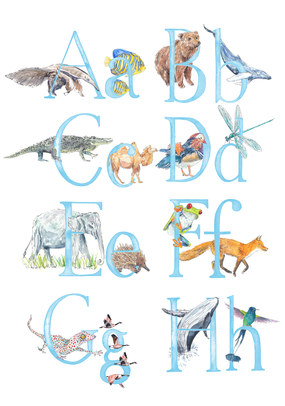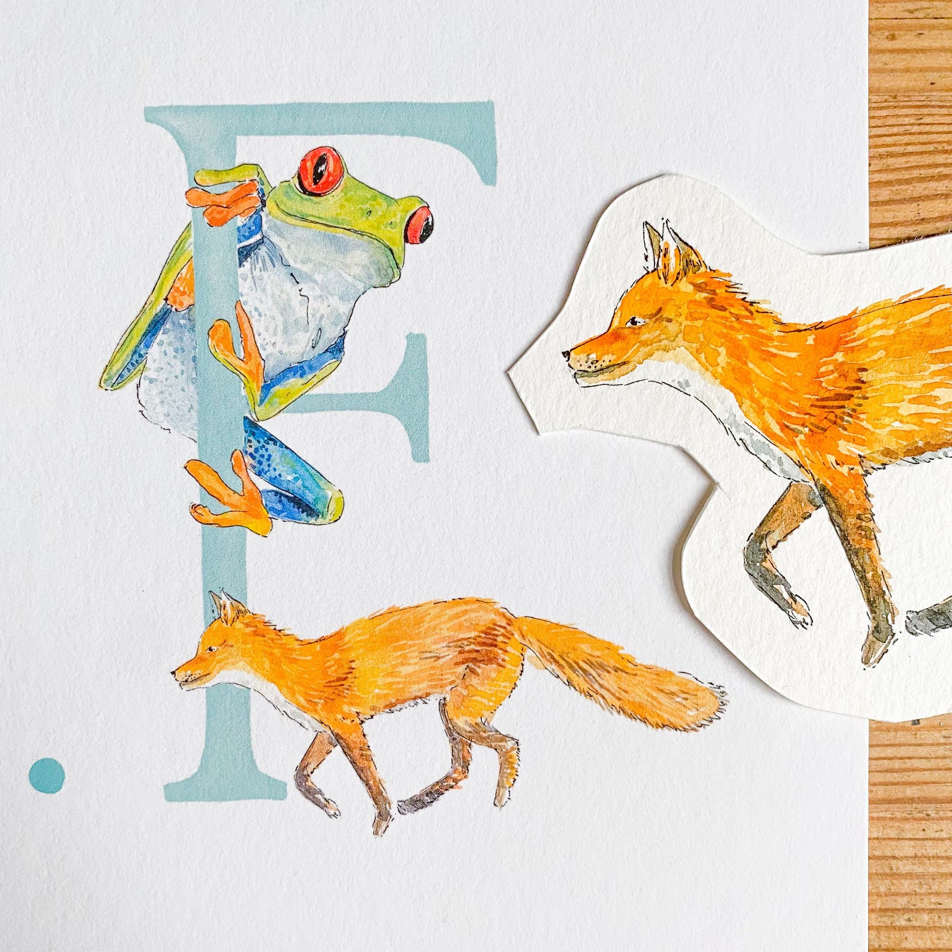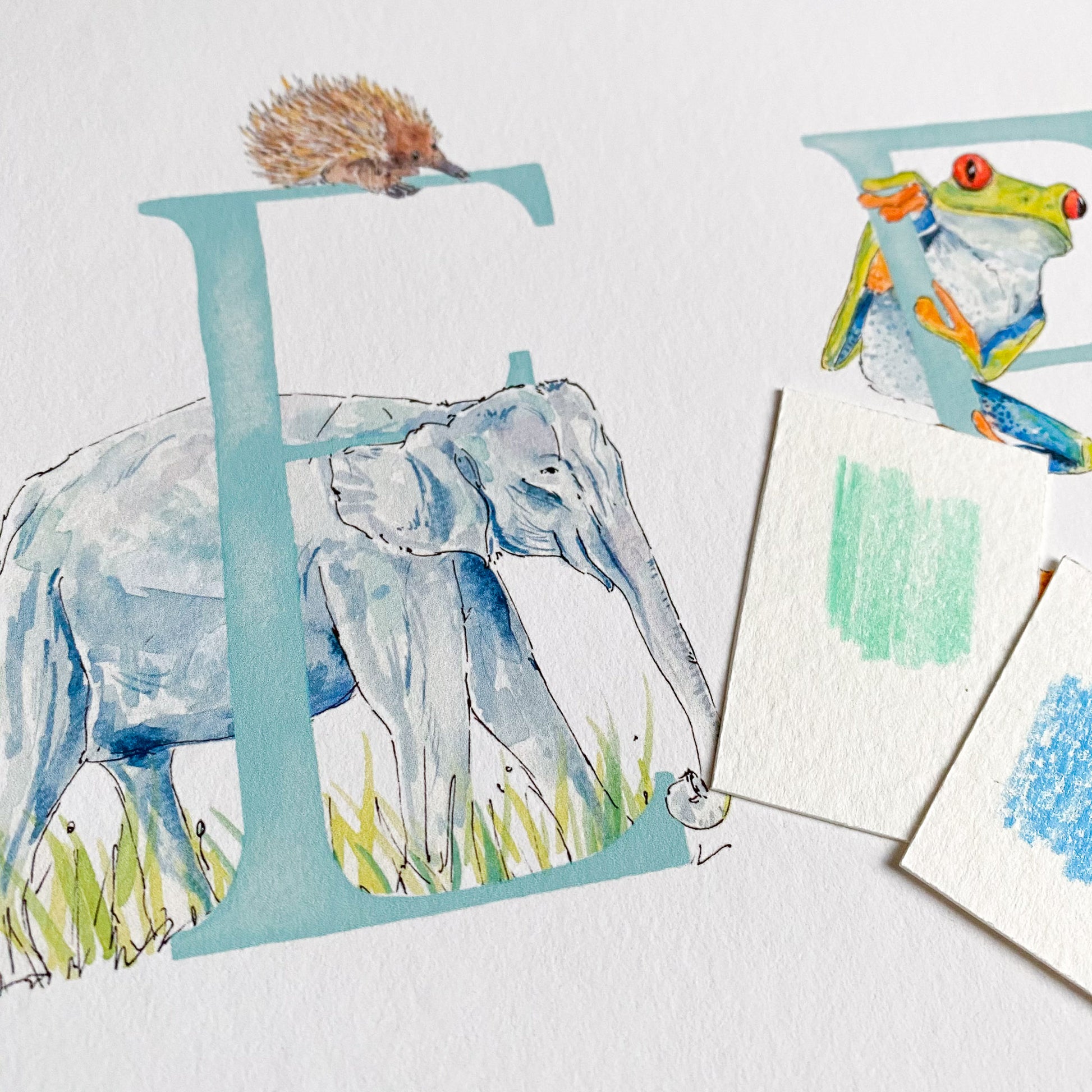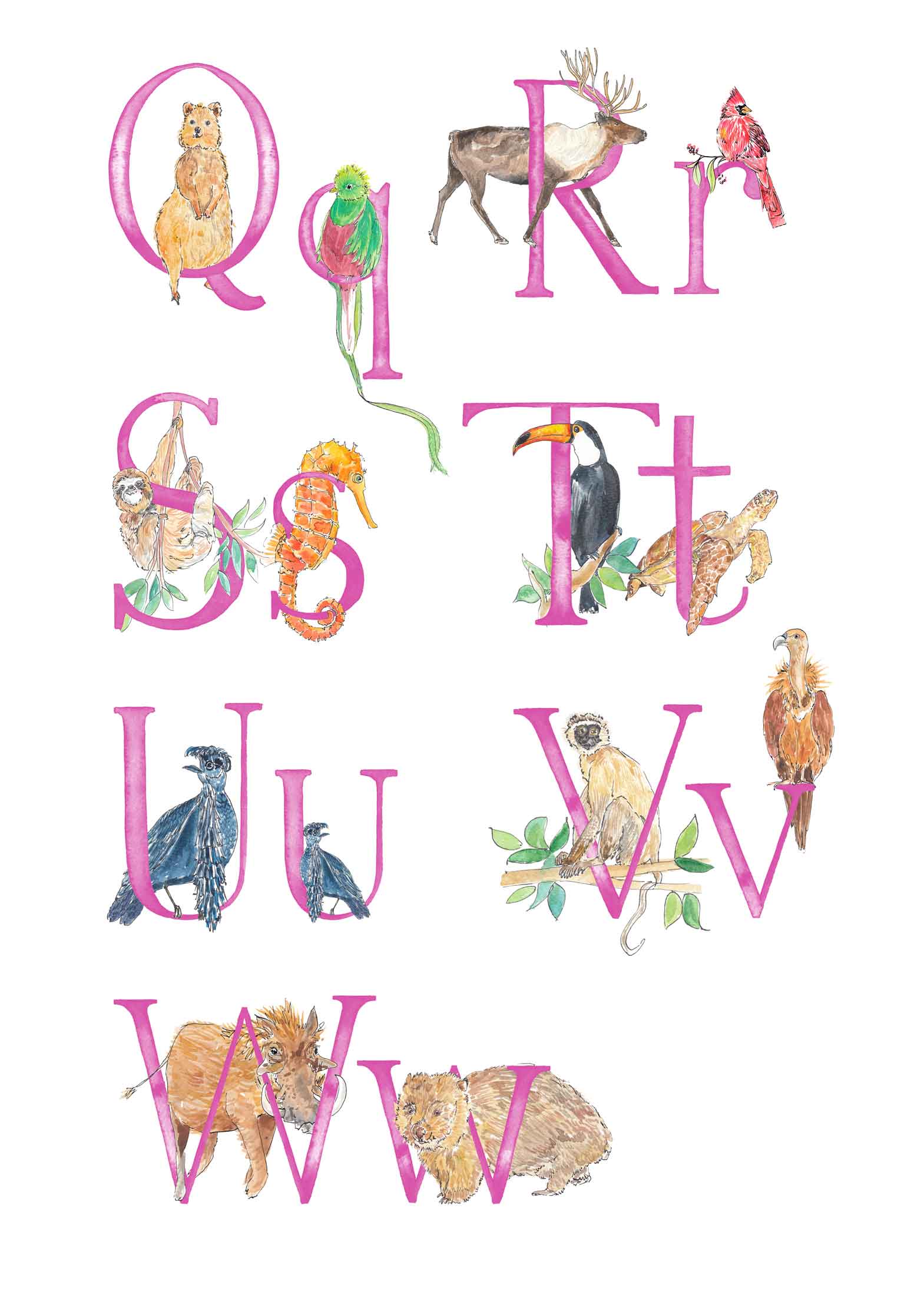 - There will be two animals for each letter - I will choose the animals to fit each letter, and make sure that the overall composition of the print is balanced, but if you'd like a specific animal that you know I’ve painted, please leave a note (you can do this when you click on basket) and I’ll do my best to include it. The animals included in the images are just a suggestion - these aren't final