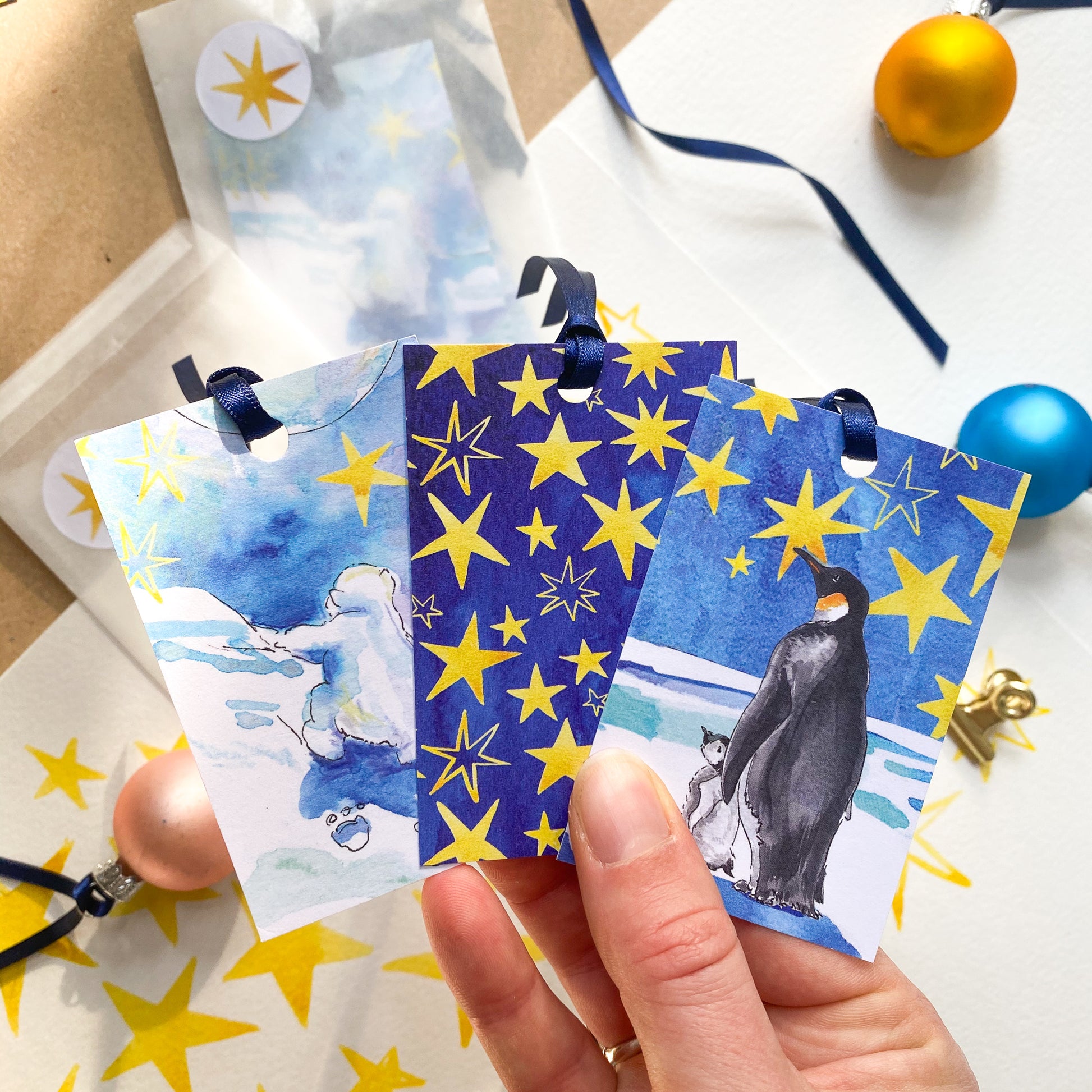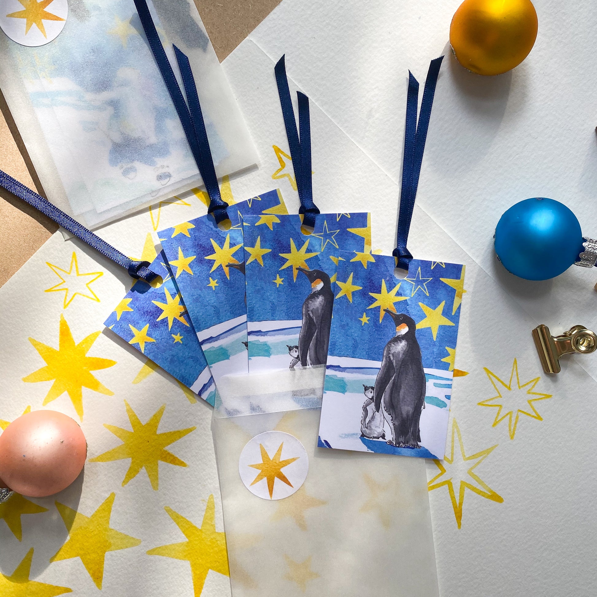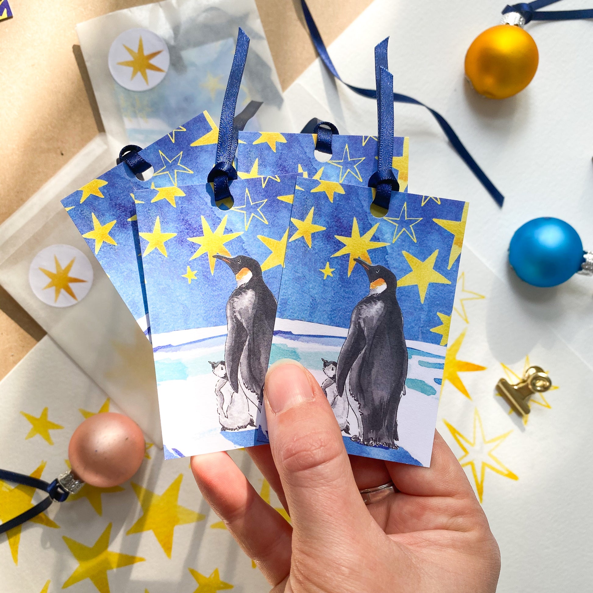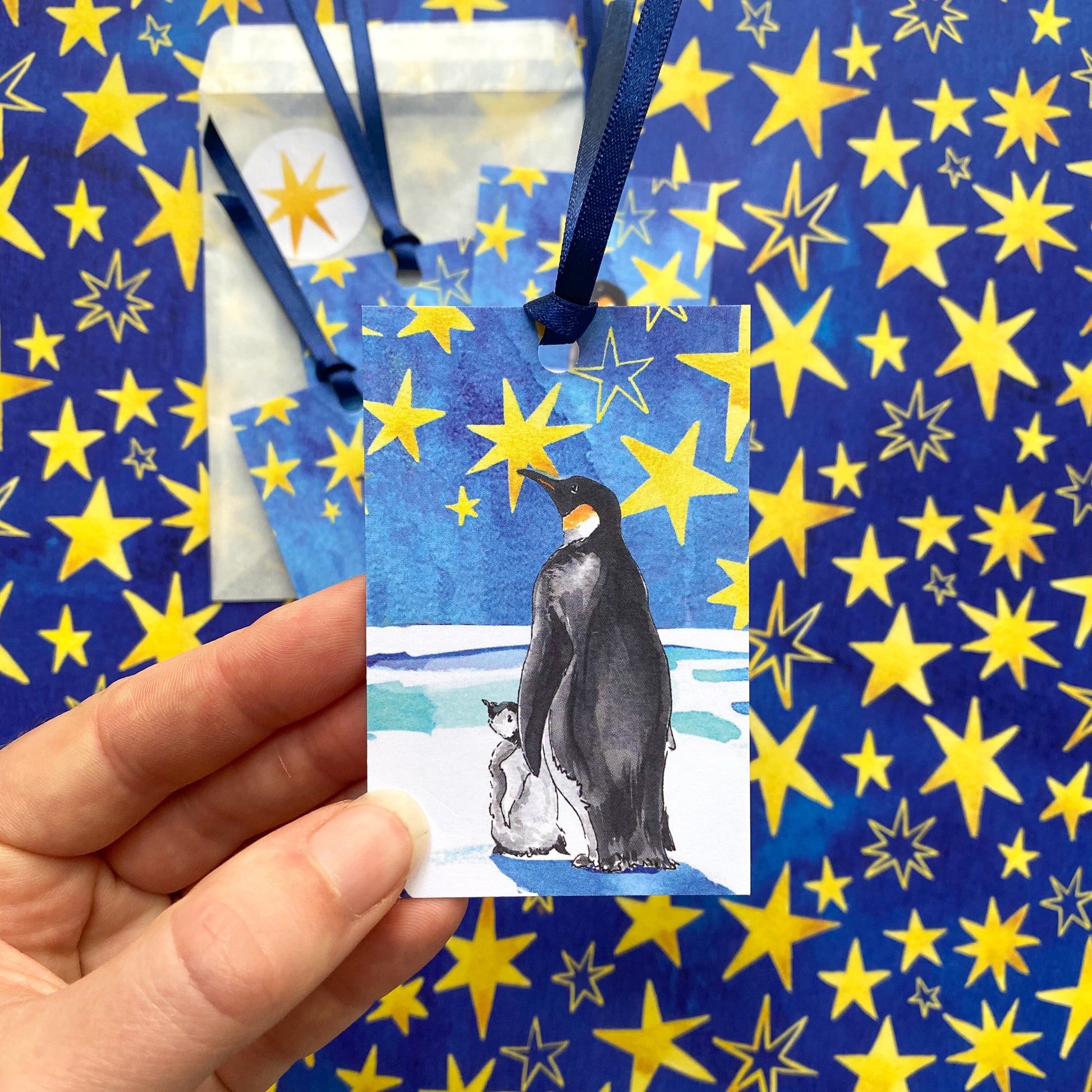 A set of gift-tags featuring an emperor penguin and its baby gazing at a starry sky. The gift tags measure 55x85mm, and are blank on the reverse with plenty of space for a lovely message.