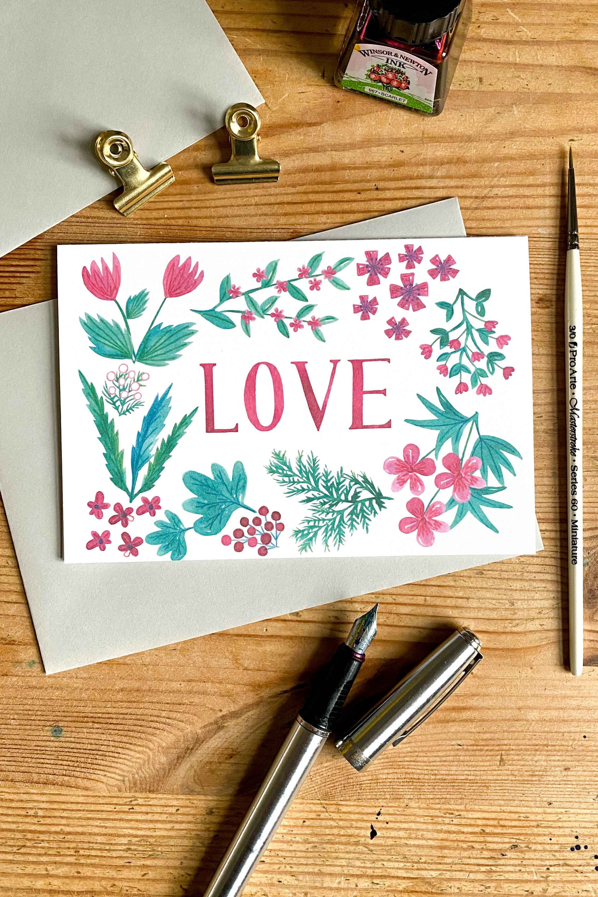 The card is created from original ink illustrations and lettering and is proudly printed in the UK on FSC certified 300GSM paper stock. Each card is A6 size (105x148mm) and comes with a crisp pale grey envelope.
