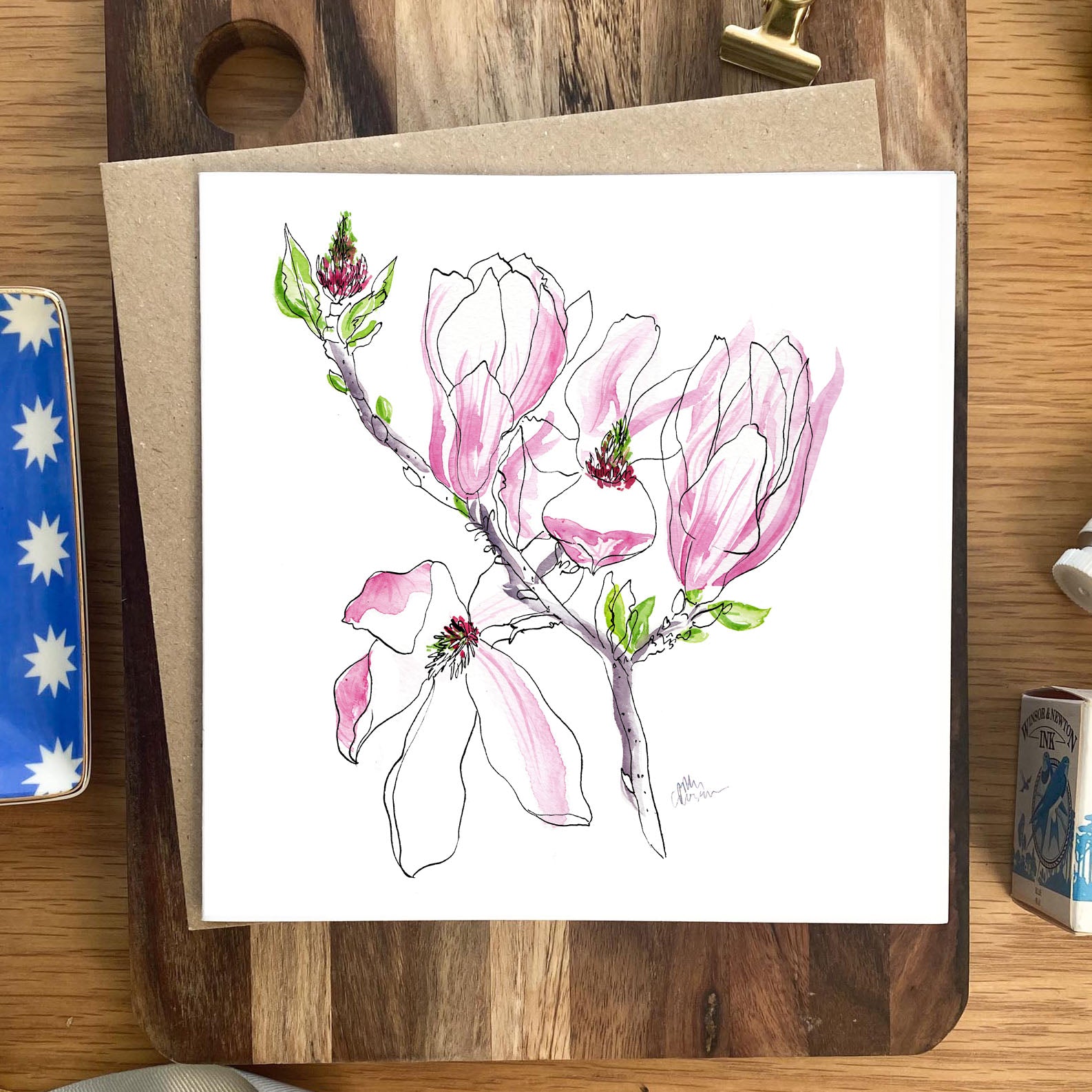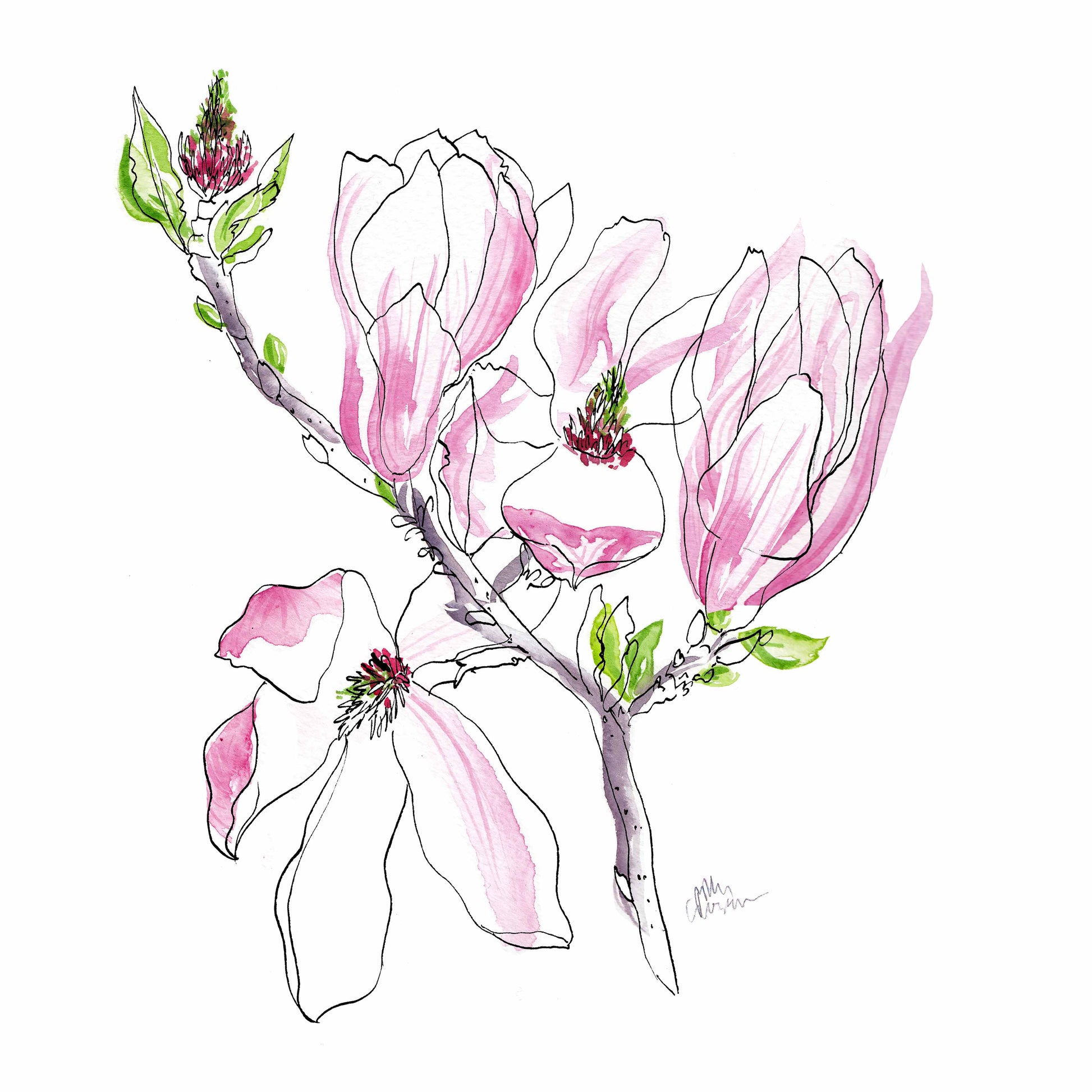 A digital art print created from hand-drawn and hand-painted original artwork, drawn from life of fresh Magnolia flowers.