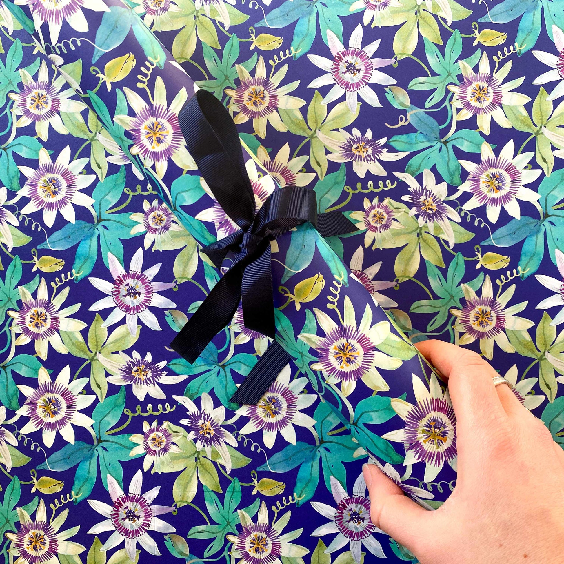The greens of the leaves and purple details of the flowers contrast perfectly against a deep navy background for the most stylish gift-wrapping around.