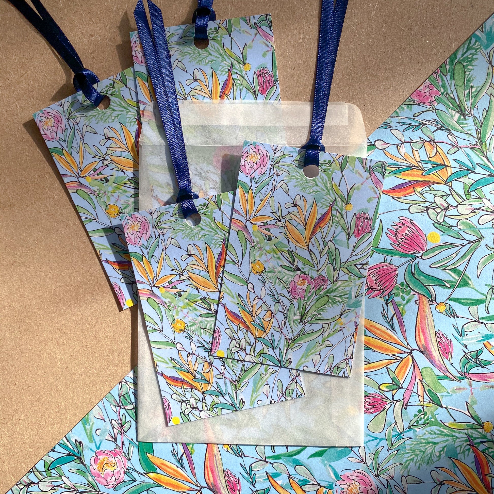 A set of gift-tags where protea and peonies are joined by birds of paradise in a tropical inspired pattern. The gift tags measure 55x85mm, and are blank on the reverse with plenty of space for a lovely message.