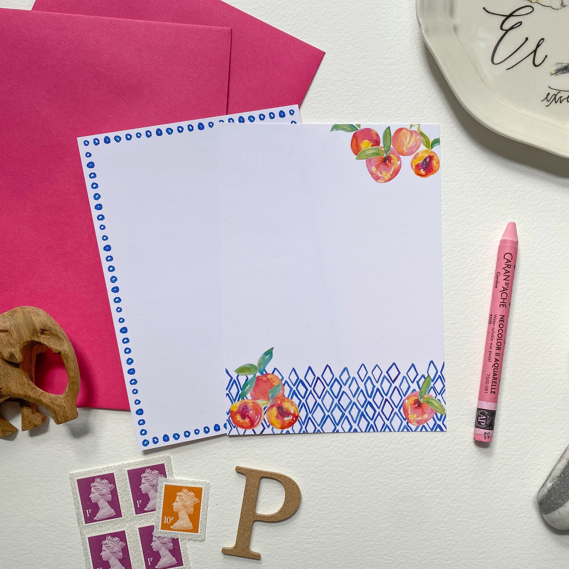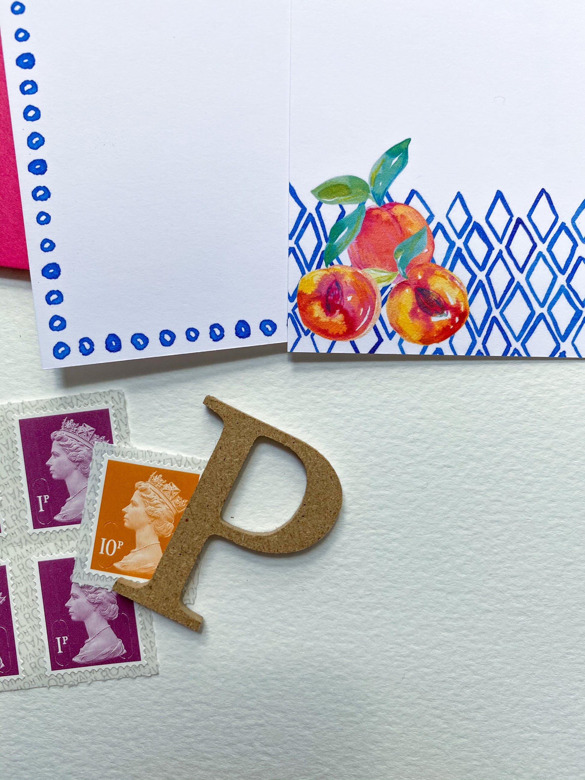The Polly Peach set includes three notelets each of two designs – a gorgeous peach design, combining inky peaches with deep blue diamonds, and a simple blue polka dot border design.