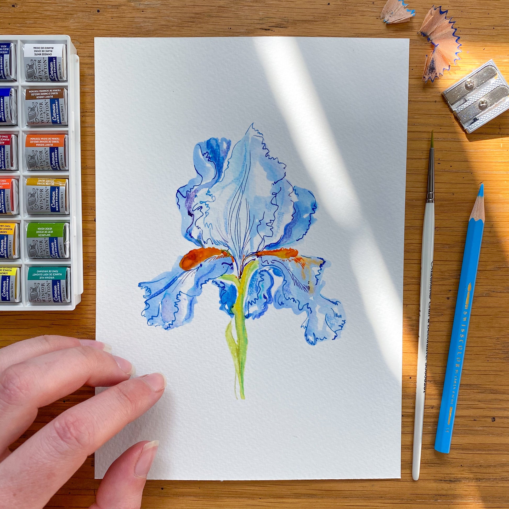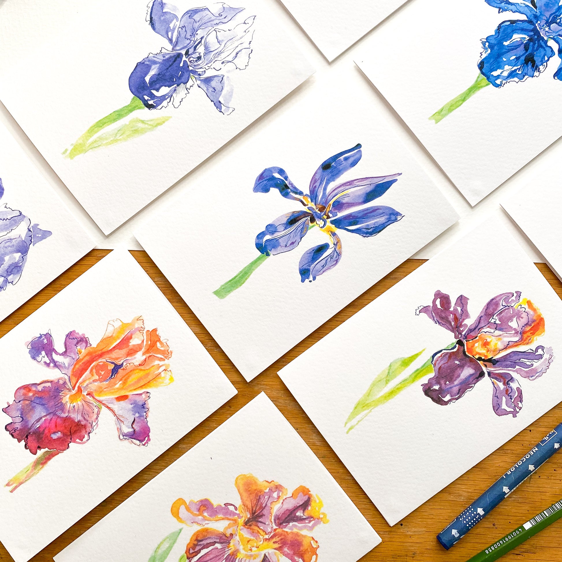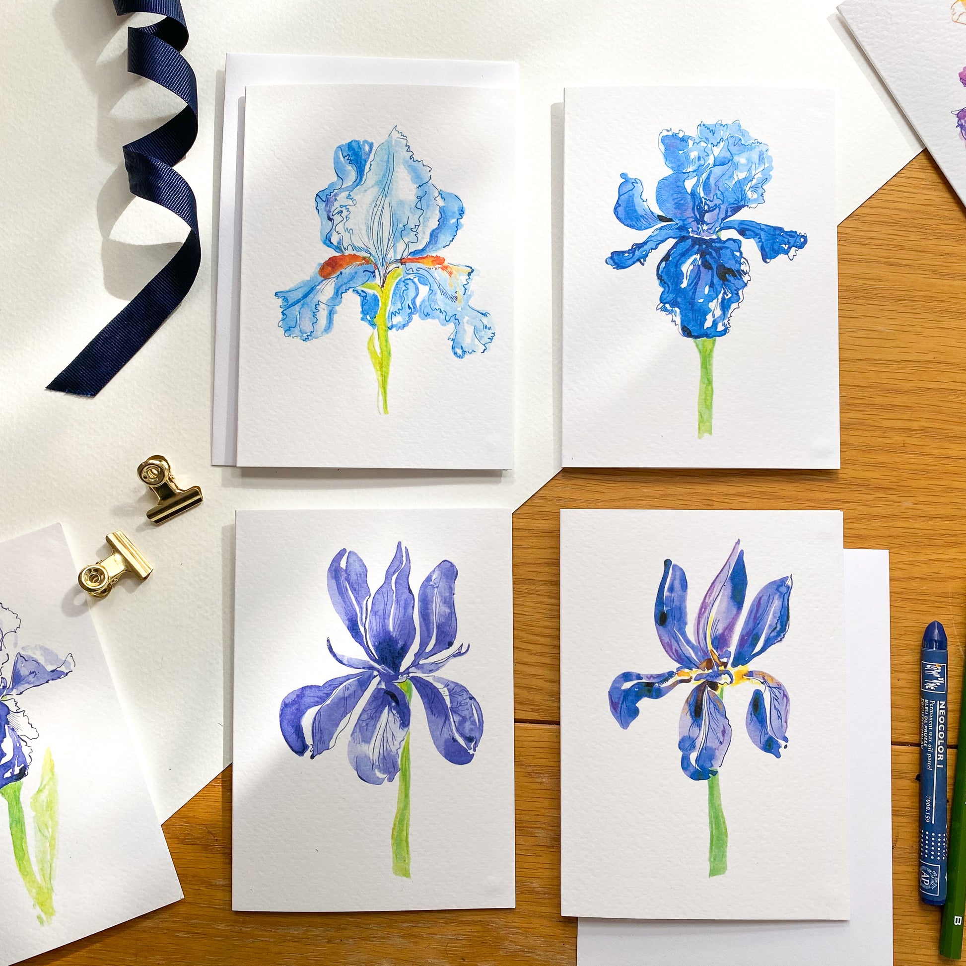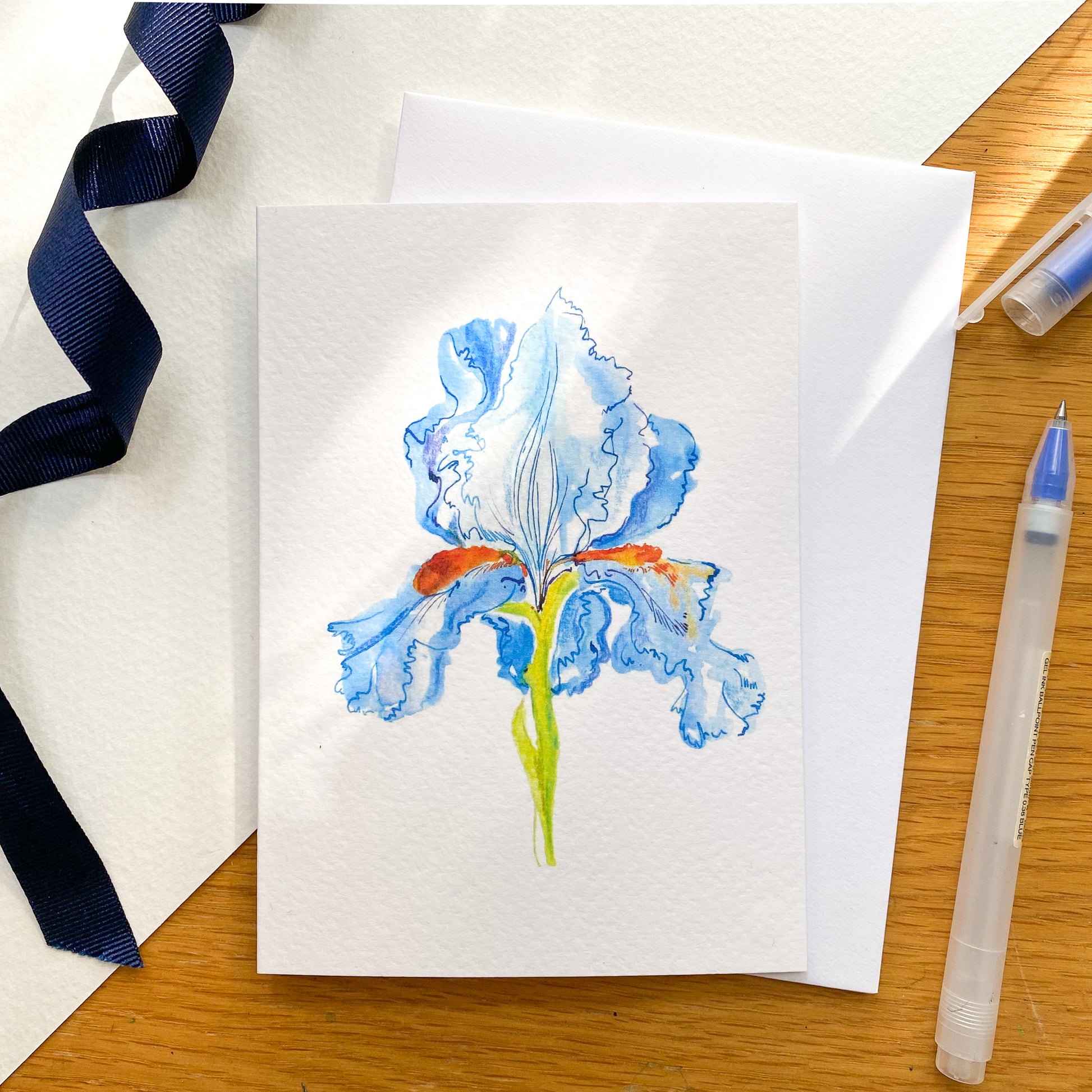 This card was created from an original ink painting of an iris. These paintings were inspired by watching irises come up day by day in Polly’s garden during the UK lockdown in April 2020. Irises are often seen as a symbol of hope, faith and wisdom, and Iris was the Greek Goddess of rainbows; they are the perfect floral symbol for this time.