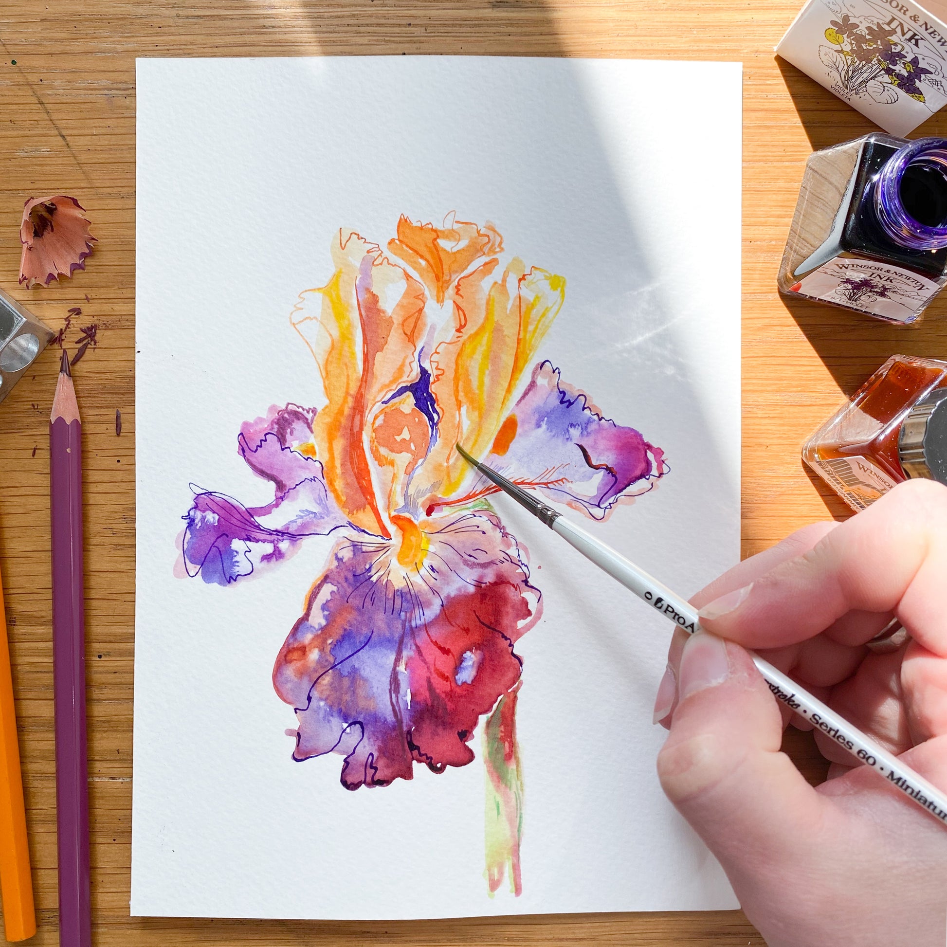 This card was created from an original ink painting of an iris. These paintings were inspired by watching irises come up day by day in Polly’s garden during the UK lockdown in April 2020. Irises are often seen as a symbol of hope, faith and wisdom, and Iris was the Greek Goddess of rainbows; they are the perfect floral symbol for this time.