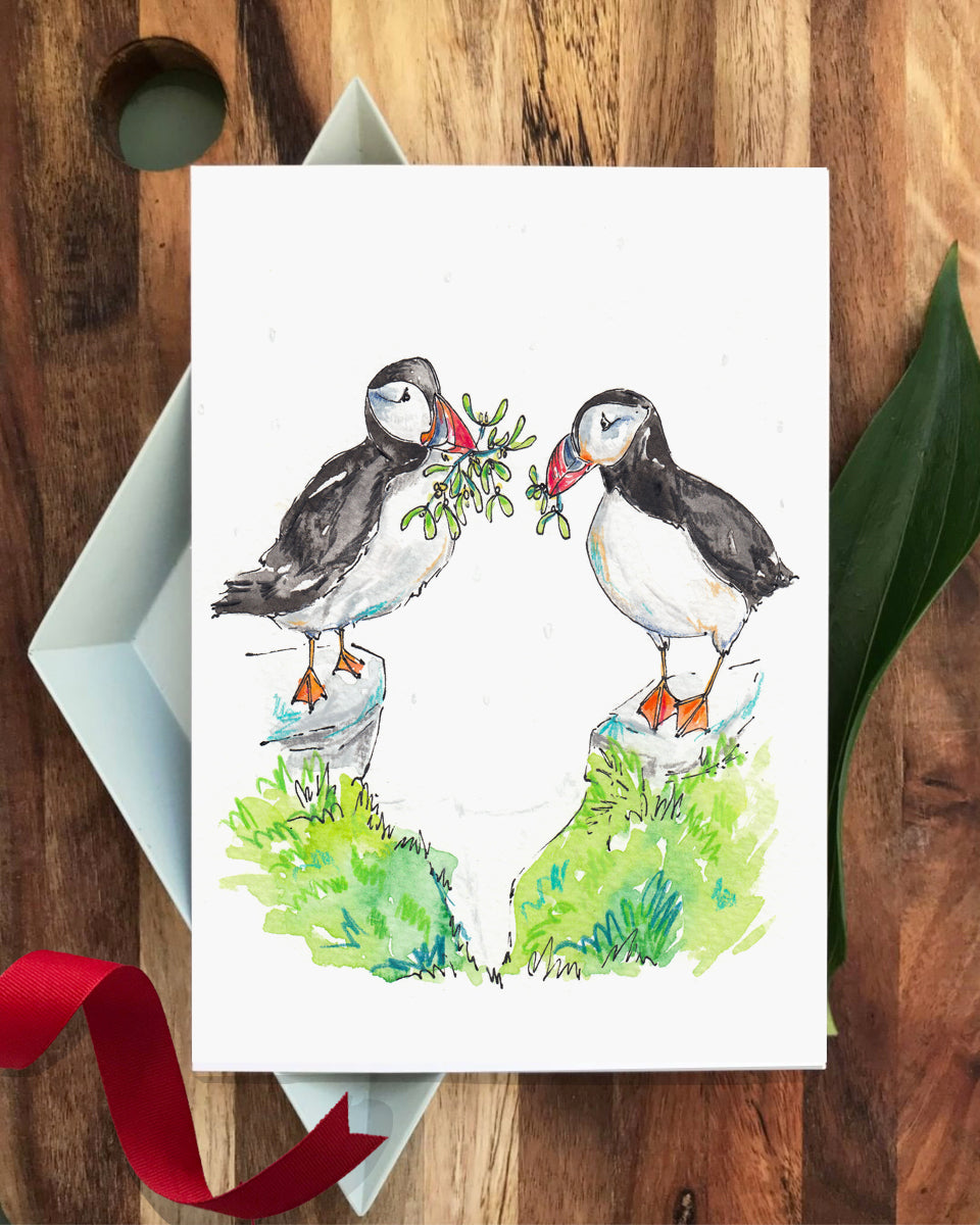This a Christmas card of the ‘Two Puffins Kissing’ design from the 'Four Birds of Christmas' collection. The cards are created directly from Polly’s original ink and watercolour illustrations and are blank inside for your own festive wishes.