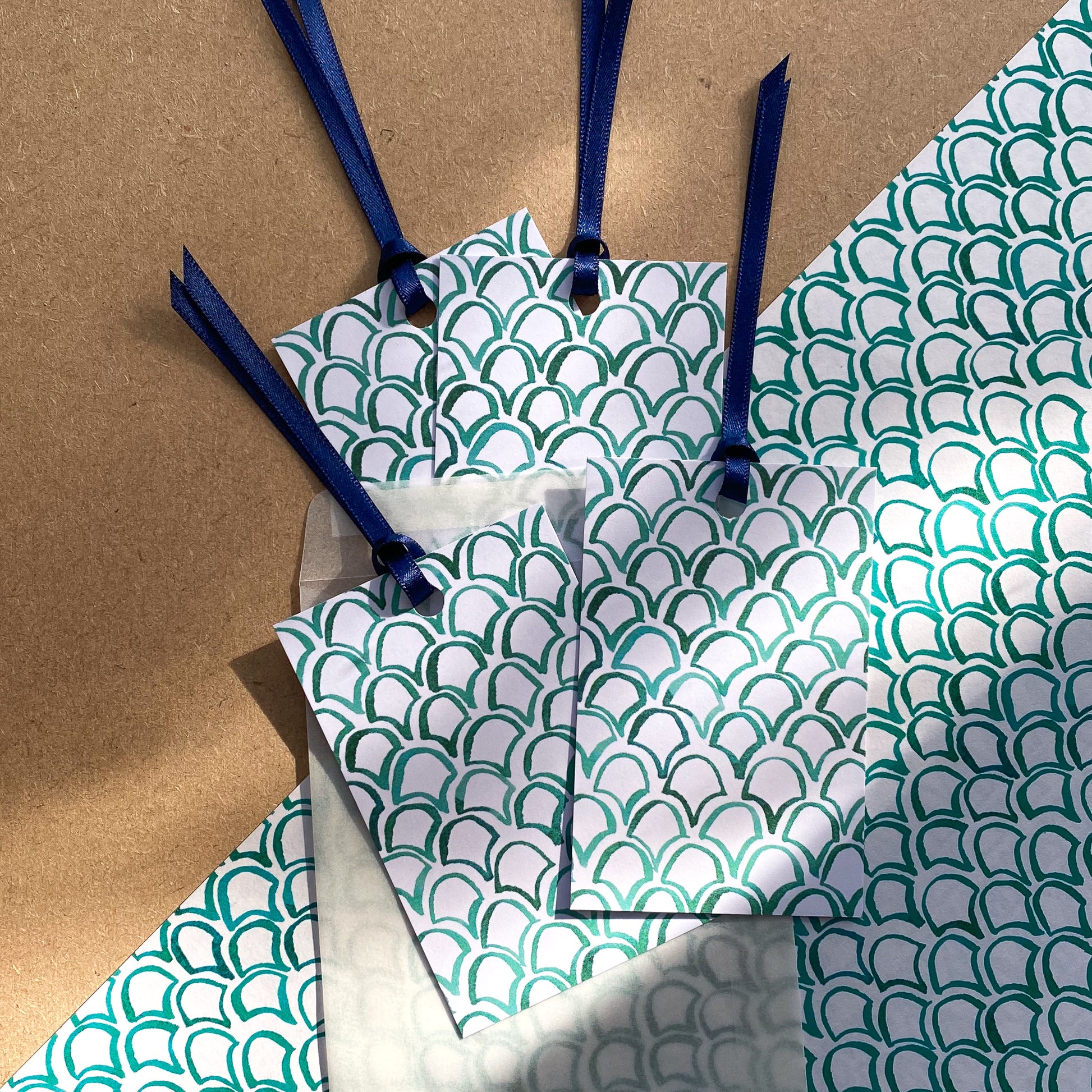 A set of gift-tags featuring a geometric scallop pattern in the perfect shade of green, inspired by the cooling tiles of Moroccan riads. The gift tags measure 55x85mm, and are blank on the reverse with plenty of space for a lovely message.