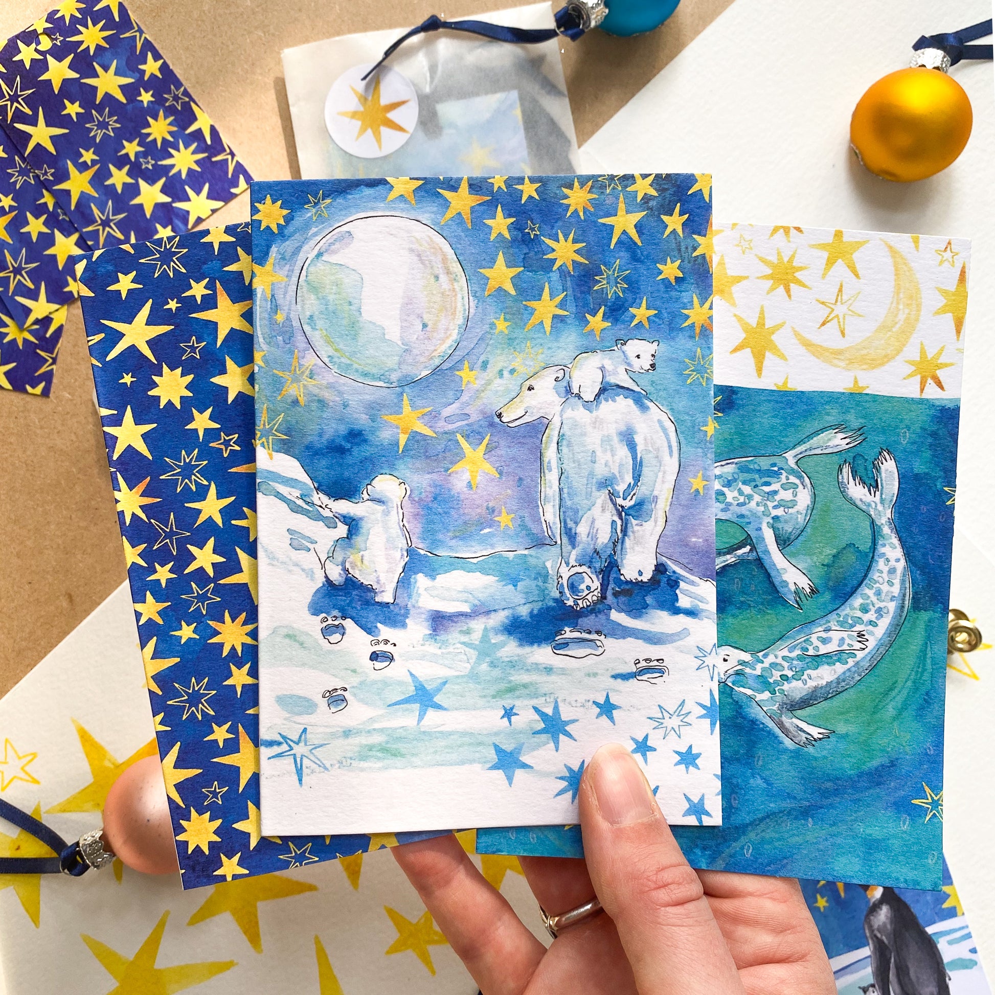 The ‘Starry Starry Night’ Christmas card collection (this is one of three in the collection) is inspired by the idea of hope; hope that things will get better and we will all be stronger and braver. The designs also act as a message of hope for the planet in the midst of climate change. Let's take courage in sharing the same star filled sky with each other – as well as the seals.