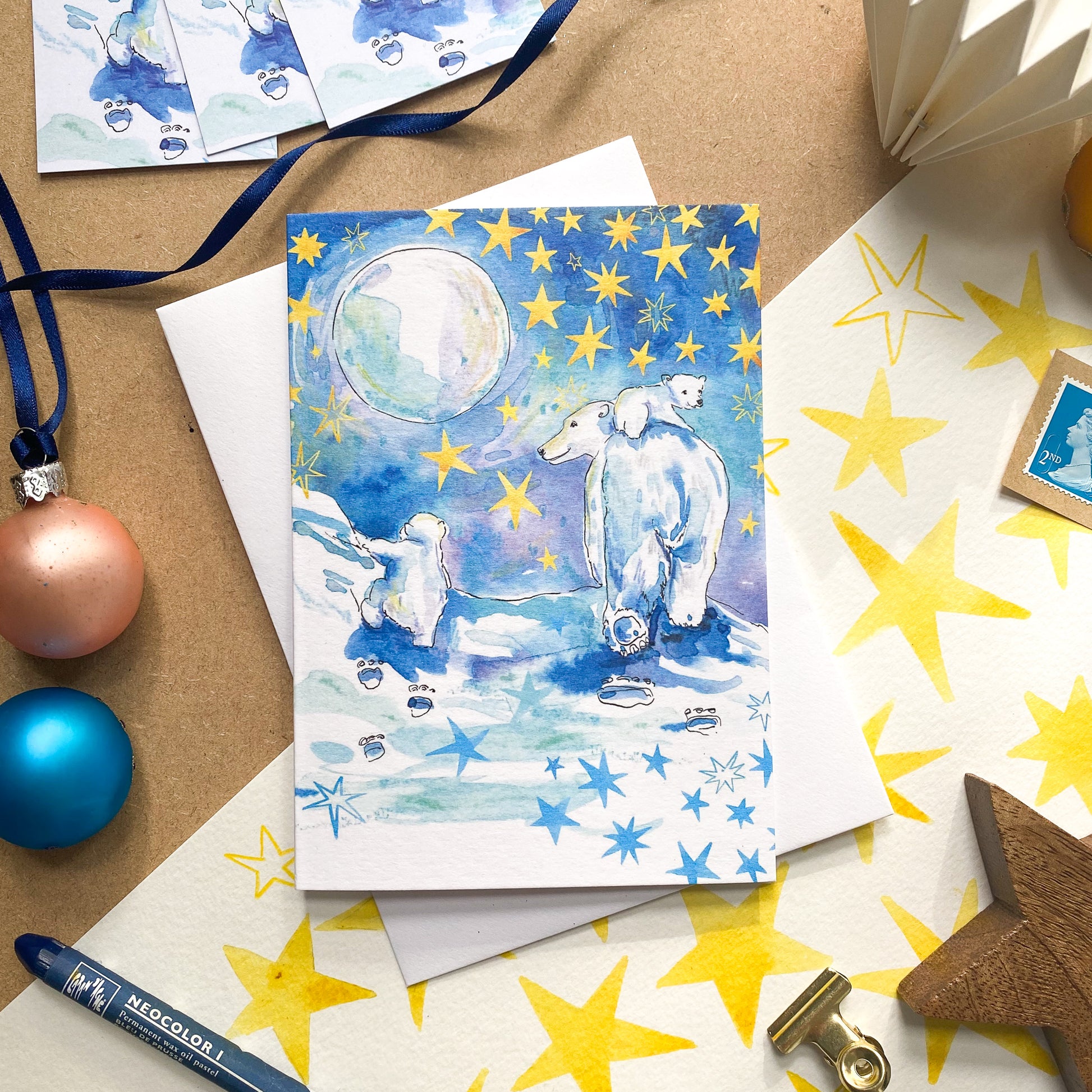 The ‘Striding Home for Christmas’ card design is created from Polly’s original pen and ink illustrations of polar bears, the moon and stars.
