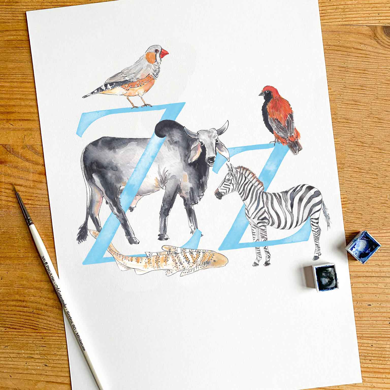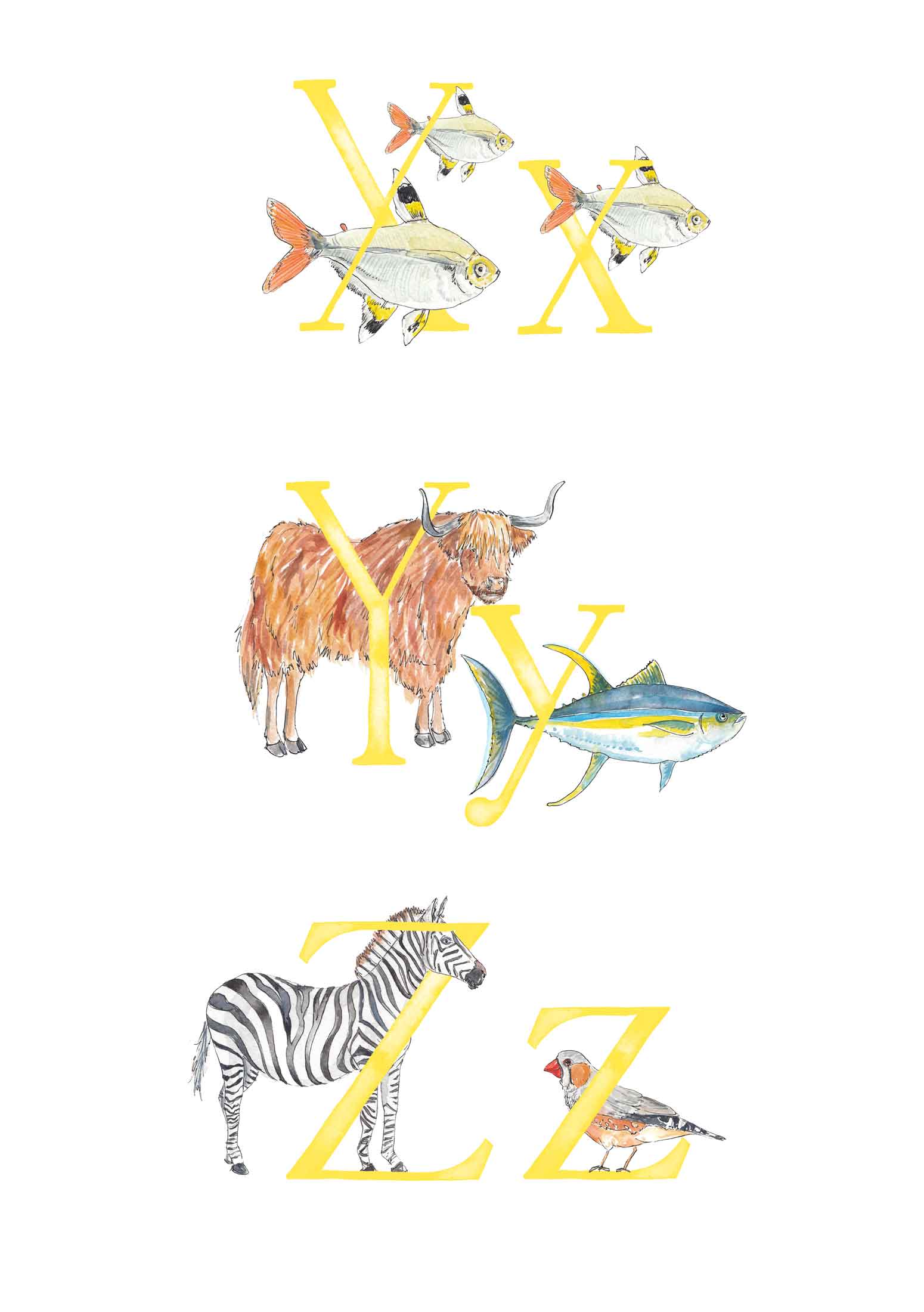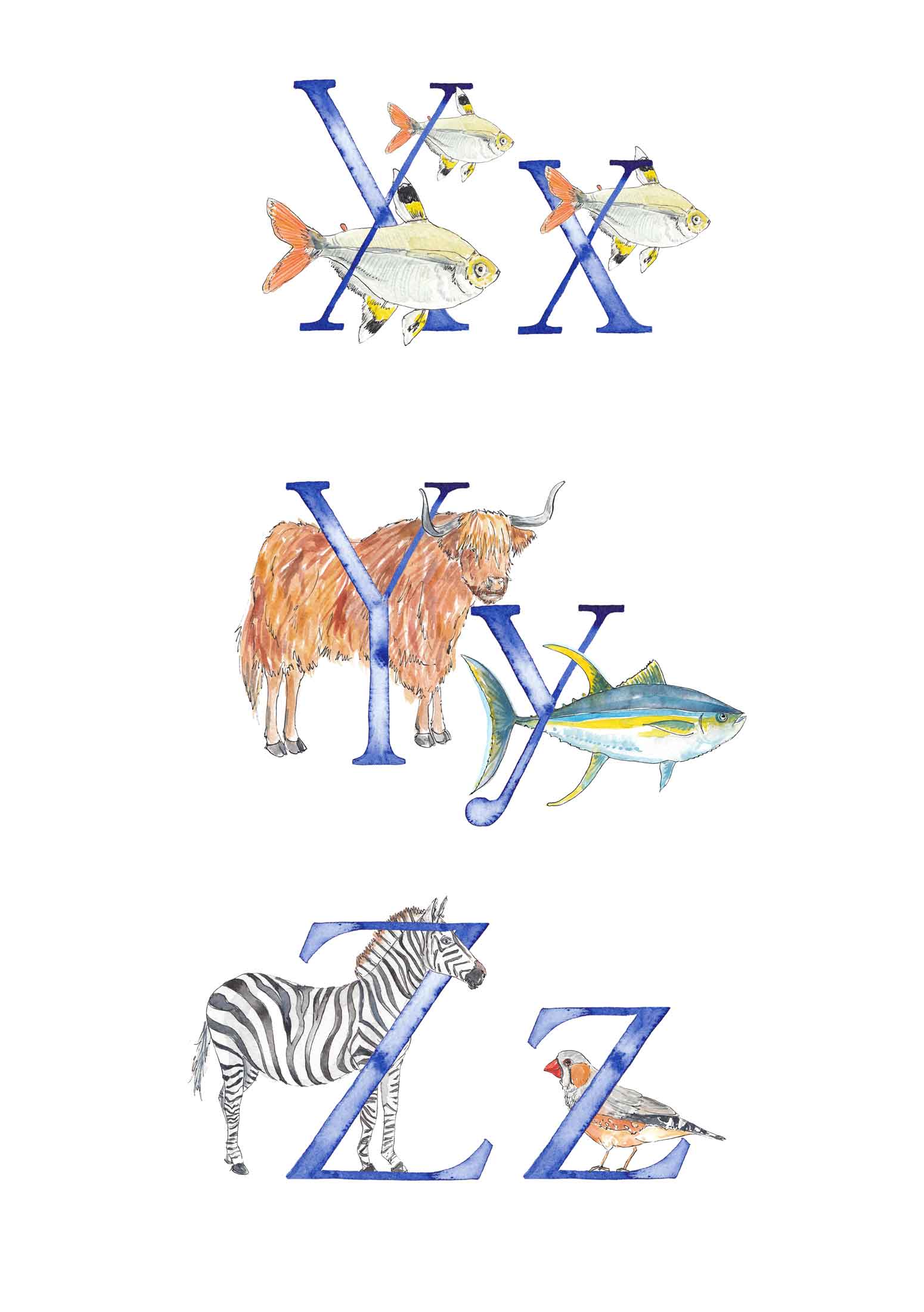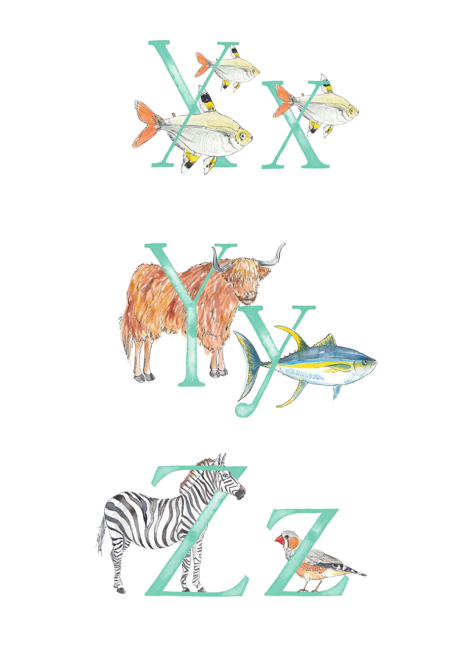 You might have arrived here in search of an U, V, X, Y or Z letter print; rest assured I am working away at these! You can see the animals I've painted and have planned below - and there are more to add after some research! You can see single letters in the images too.