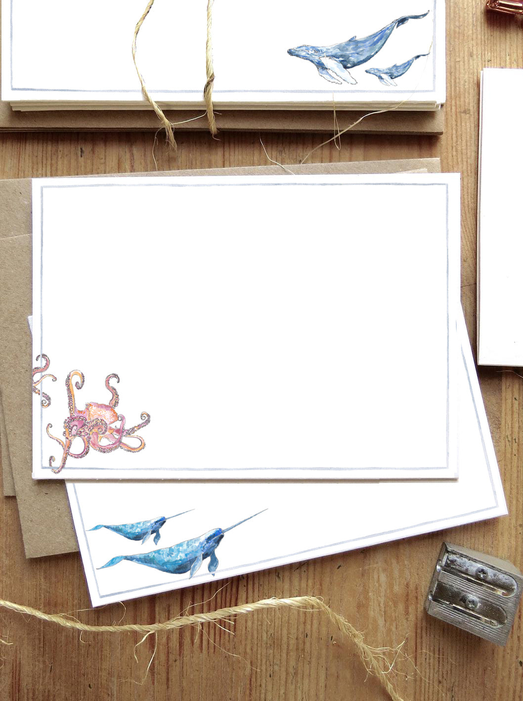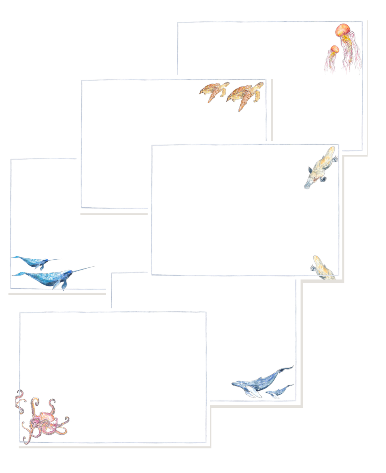 ‘Under the Sea’ notelets are illustrated with blue whales, turtles, jellyfish, octopus, narwhal and platypi.